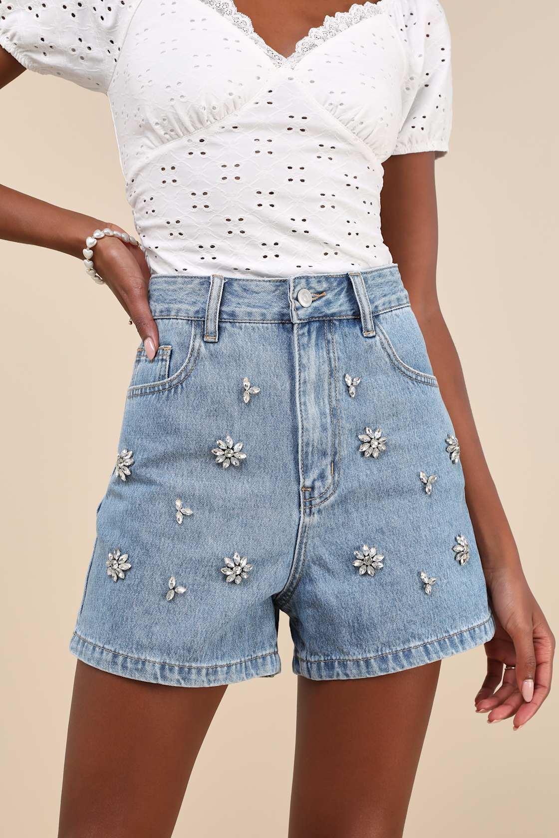 Bring the Lulus Easygoing Glow Medium Wash Denim Rhinestone High-Rise Shorts along to your next festival adventure to ensure your look is iconic! Sturdy cotton denim shapes these too-cute shorts that feature a high-rise design with belt loops, a classic five-pocket cut, and a top button closure above a hidden zip fly. The relax-fit silhouette boasts dazzling rhinestone details that create flower-like shapes across the front for a stunningly fun finish.