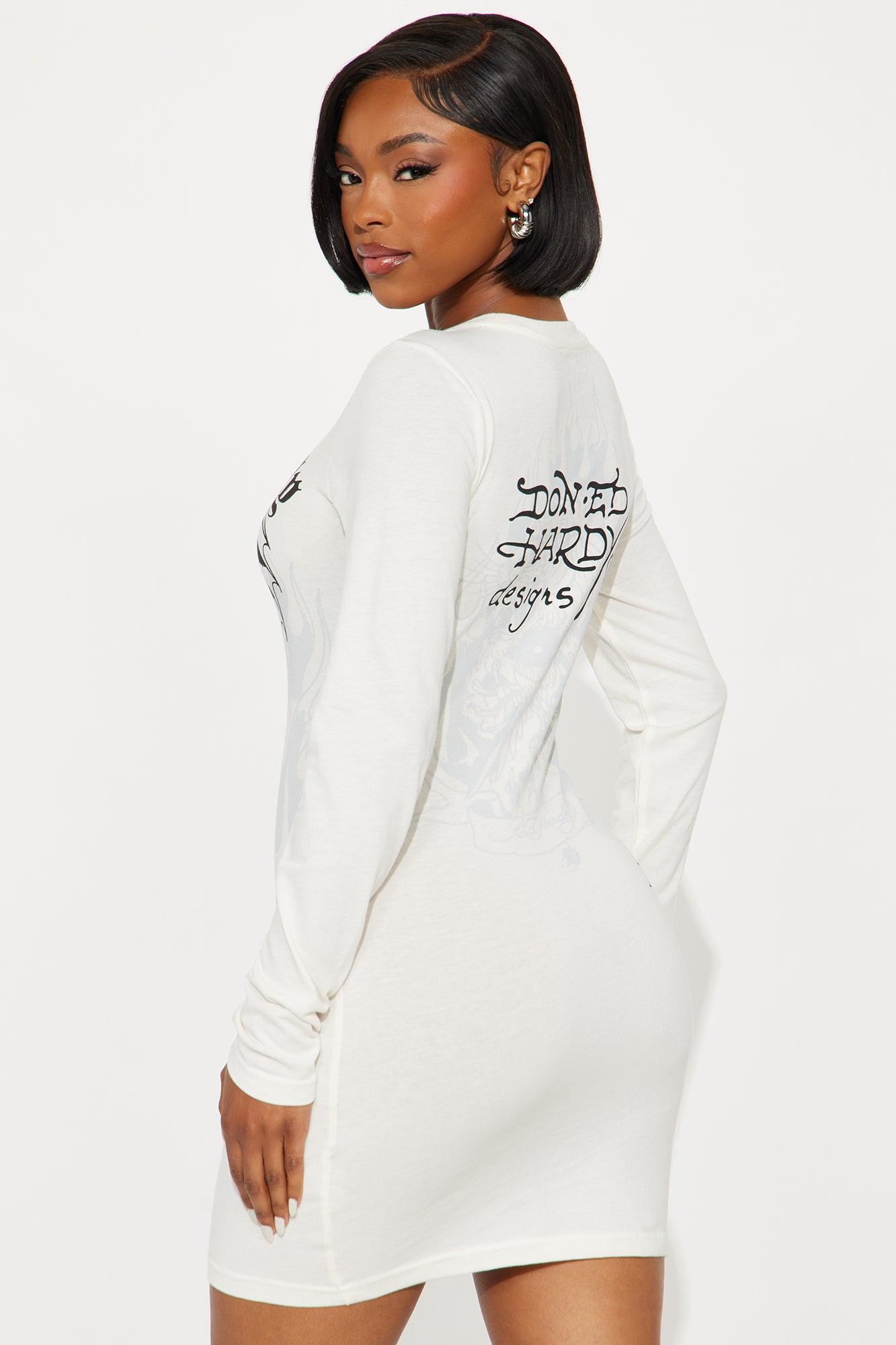 Available In Ivory. Ed Hardy Mini Dress Crew Neckline Long Sleeve Front & Back Graphic Stretch Length Measured Flat = 32" Disclaimer: Due To The Printing Process A Difference In Saturation May Occur. Each Garment Is Unique. 60% Cotton 40% Polyester Imported
