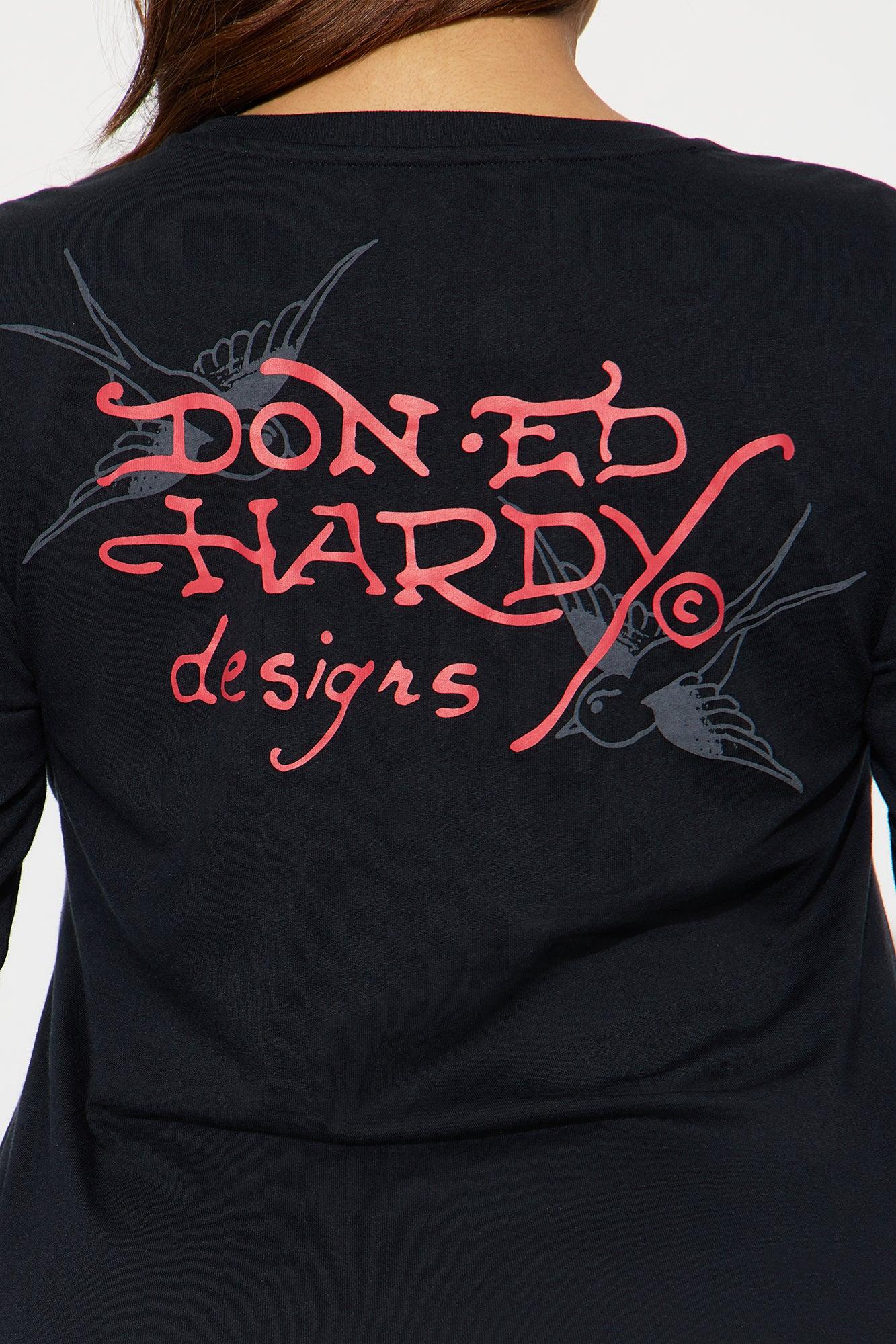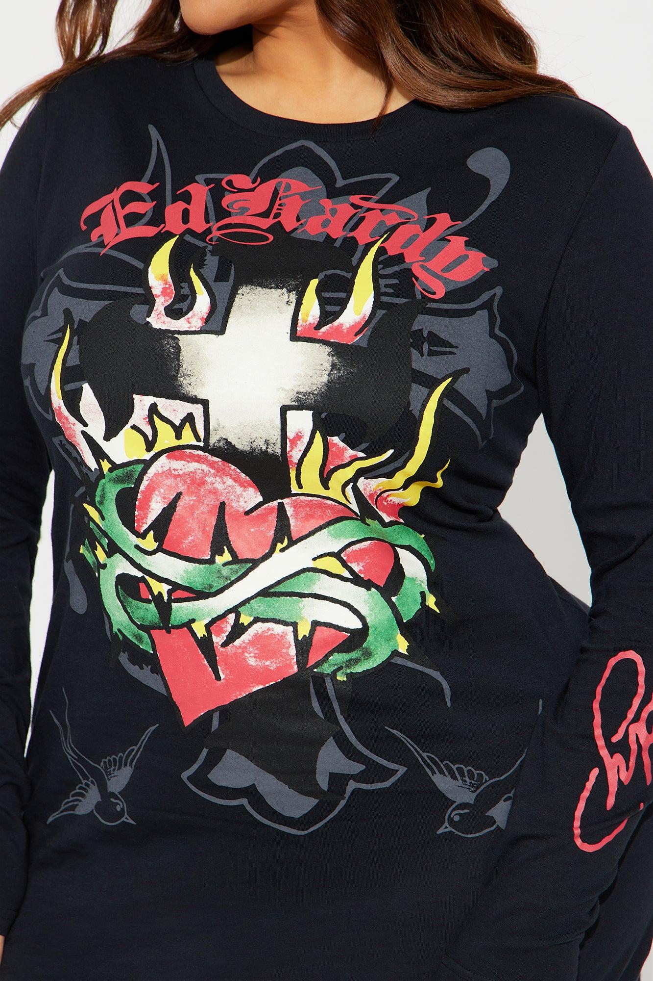 Available In Black. Ed Hardy Mini Dress Crew Neckline Long Sleeve Front & Back Graphic Stretch Length Measured Flat = 32" Disclaimer: Due To The Printing Process A Difference In Saturation May Occur. Each Garment Is Unique. Self : 60% Cotton 40% Polyester Imported