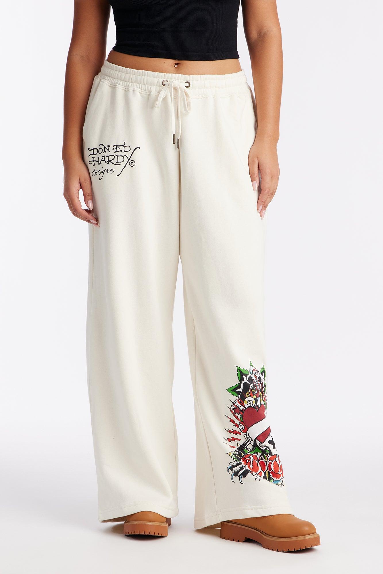 Available In Ivory. Wide Leg Pant Front And Back Screen Ed Hardy Graphic Stretch Pair To "Ed Hardy Dragon Heart Zip Front Hoodie" Disclaimer: Due To The Printing Process A Difference In Saturation May Occur. Each Garment Is Unique. 55% Cotton 45% Polyester Imported