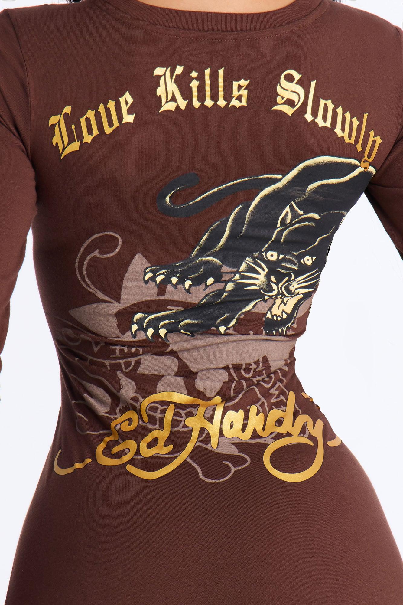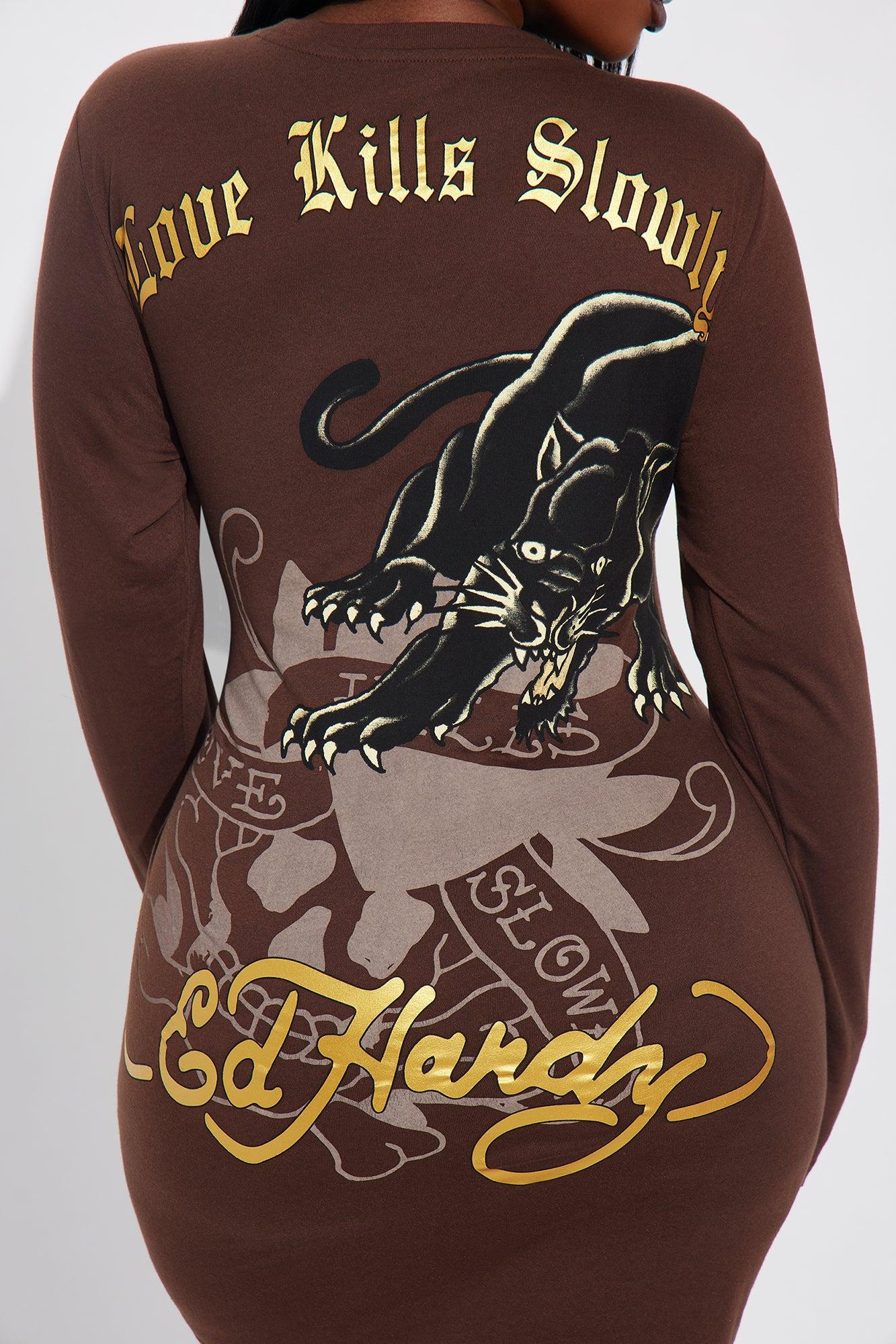 Available In Chocolate. Ed Hardy Mini Dress Crew Neckline Long Sleeve Front & Back Graphic Stretch Length Measured Flat = 32" Disclaimer: Due To The Printing Process A Difference In Saturation May Occur. Each Garment Is Unique. Self: 60% Cotton 40% Polyester Imported