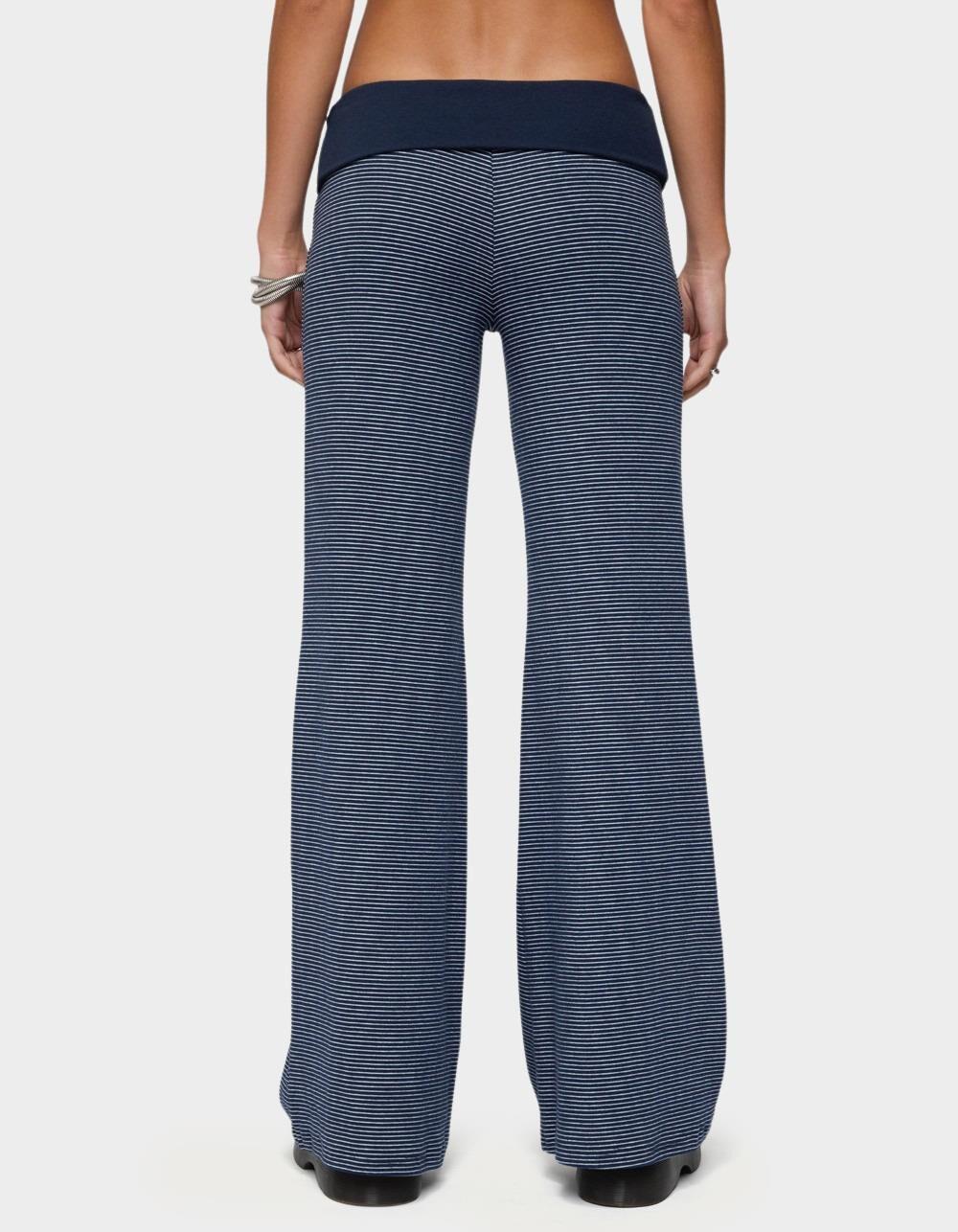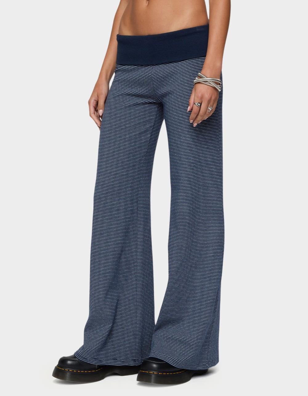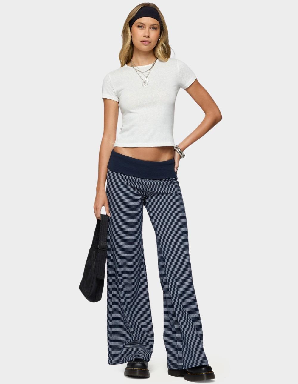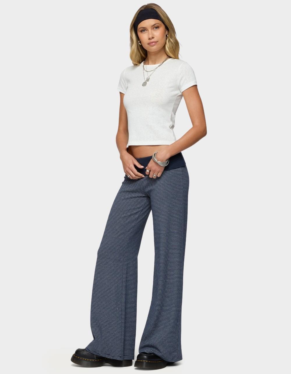 These fold-over pants are the perfect choice when you want to feel comfortable while still looking put together. Rock them with a cute hoodie to complete the look. Pants. Wide leg fit. Contrast fold over waist. Striped pattern. 75% Cotton, 15% Rayon, 10% Polyester. Model wears size S. Model height is 5'8. Item care: machine wash at maximum 30ºc, wash with similar colors, do not bleach, do not tumble dry, iron at a maximum of 110ºc, do not dry clean.This item is may take a few extra days to process. All other products in your order will be shipped separately.