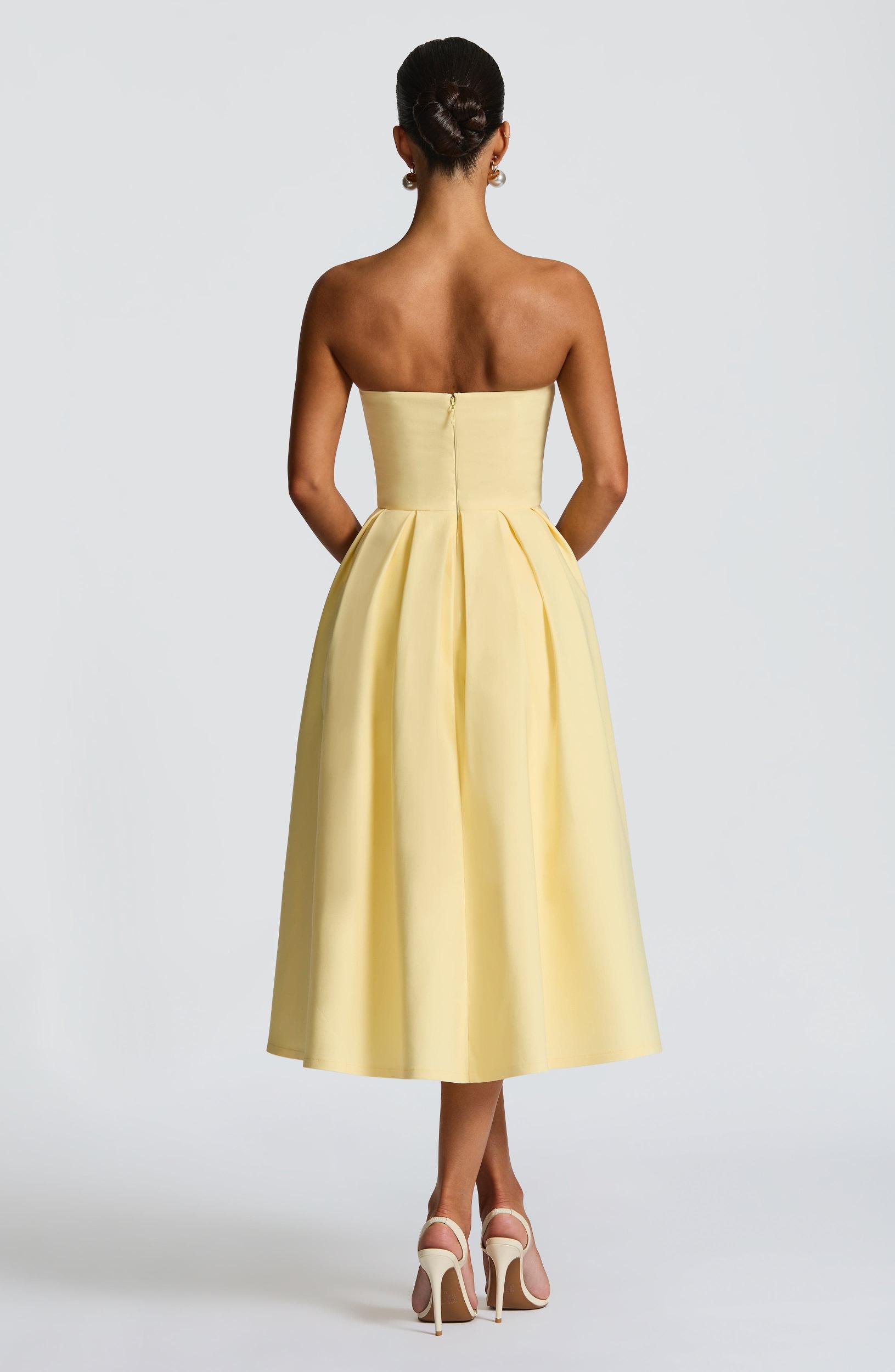 Exquisite strapless Edith Midi Dress in vibrant lemon. Features premium stretch bengaline fabric, structured bodice with elegant boning, and a graceful full skirt with refined inverted box pleats at the waist. Colour: Lemon. Stretch bengaline fabric. Fully lined. Strapless neckline. Boning in bodice. Full skirt with inverted box pleats at waist. Tulle attached to lining for volume. Invisible zipper closure.