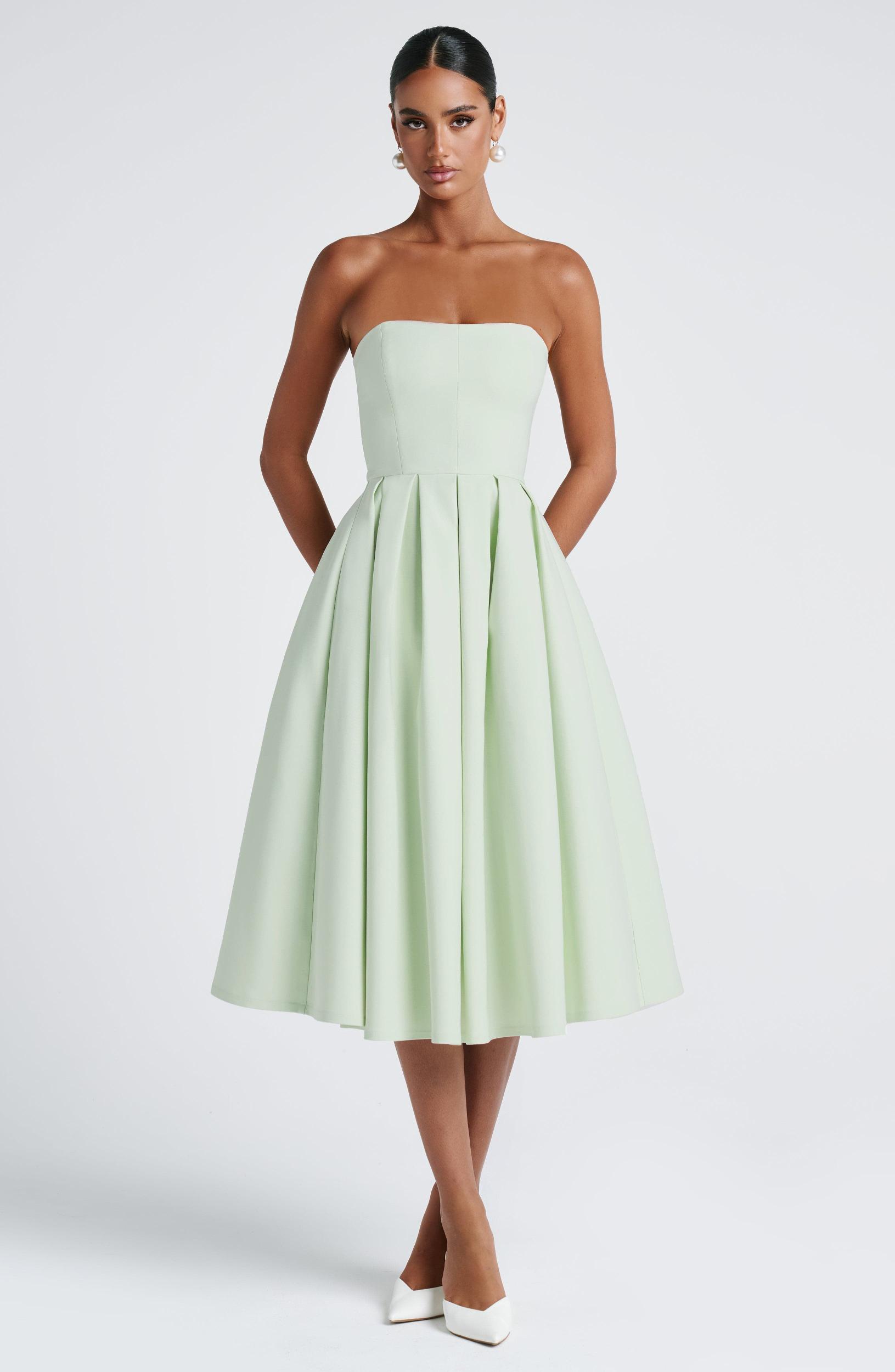 The Edith Midi Dress in Mint is a fresh, feminine design that blends classic elegance with a modern twist. This strapless dress features boning in the bodice for a structured and flattering fit. The full skirt is beautifully pleated at the waist, with tulle attached to the lining for added volume and movement, creating a soft, flowing silhouette. Colour: Mint. Midi Length. Stretch benagline fabric. Fully lined. Strapless neckline. Boning in bodice. Full skirt, pleated at waist. Tulle attached to lining for added volume. Invisible zipper closure.
