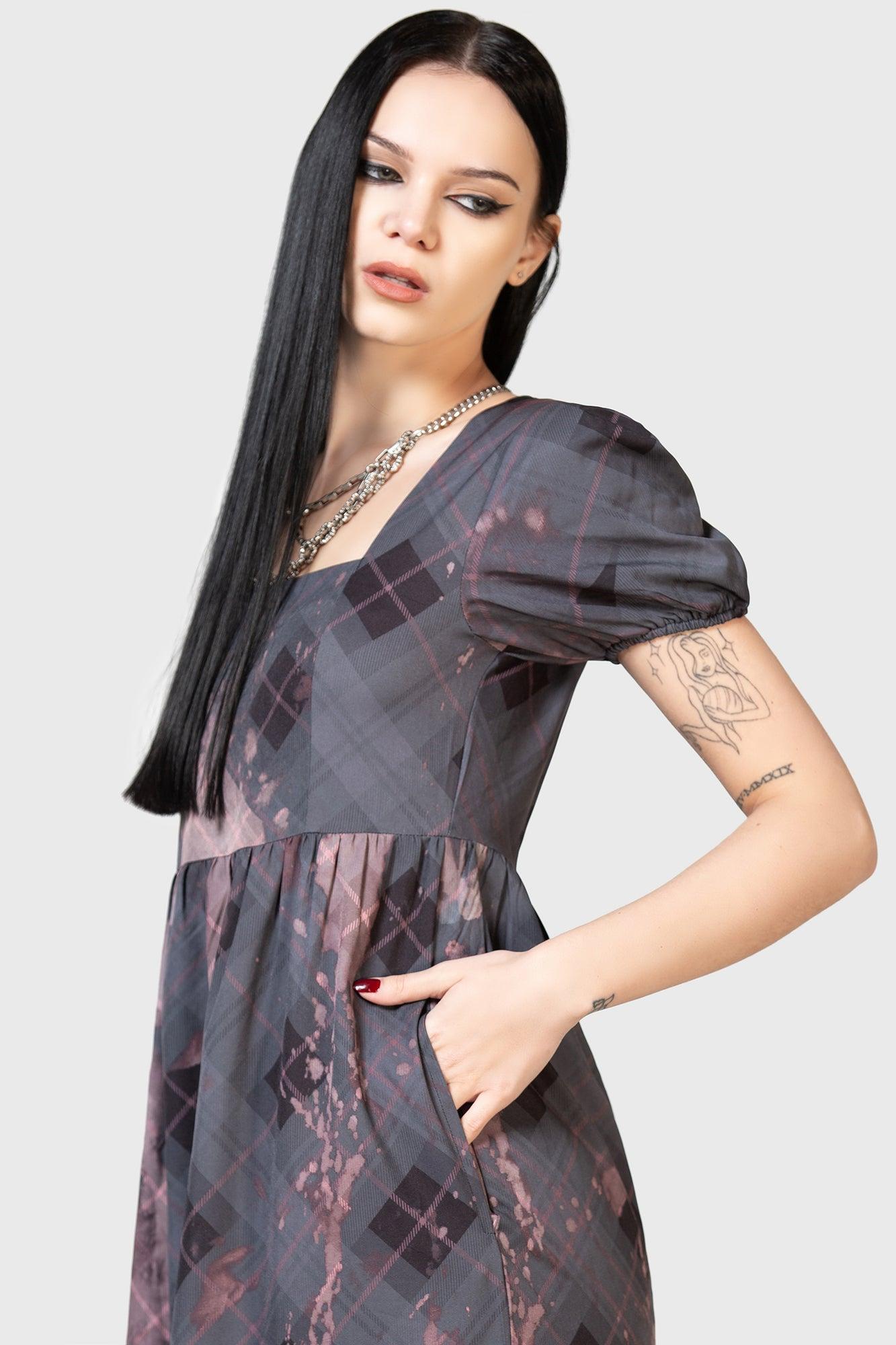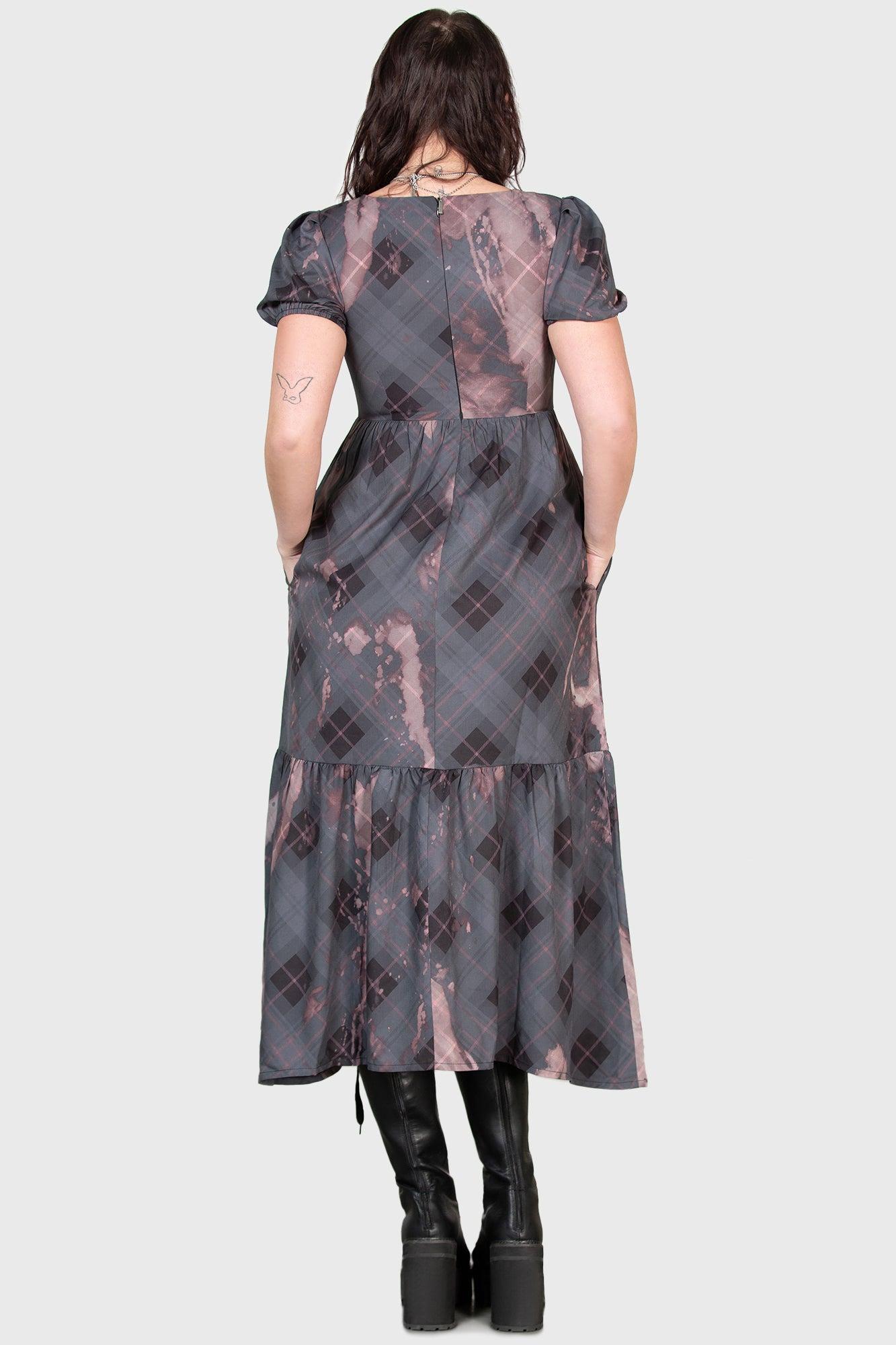 EFFINA'S RUIN.- Soft stretch fabric.- Statement bleached tartan print.- Square neckline.- Pockets- Puffed sleeves.- Midi length.- Elasticated empire waist.- Rear zip closure.- Fitted.With KILLSTAR branding, 96% Polyester, 4% Elastane.Machine wash cold (30°c) / Do not bleach / Do not tumble dry / Iron at low temperature / Do not dry clean. Imported.