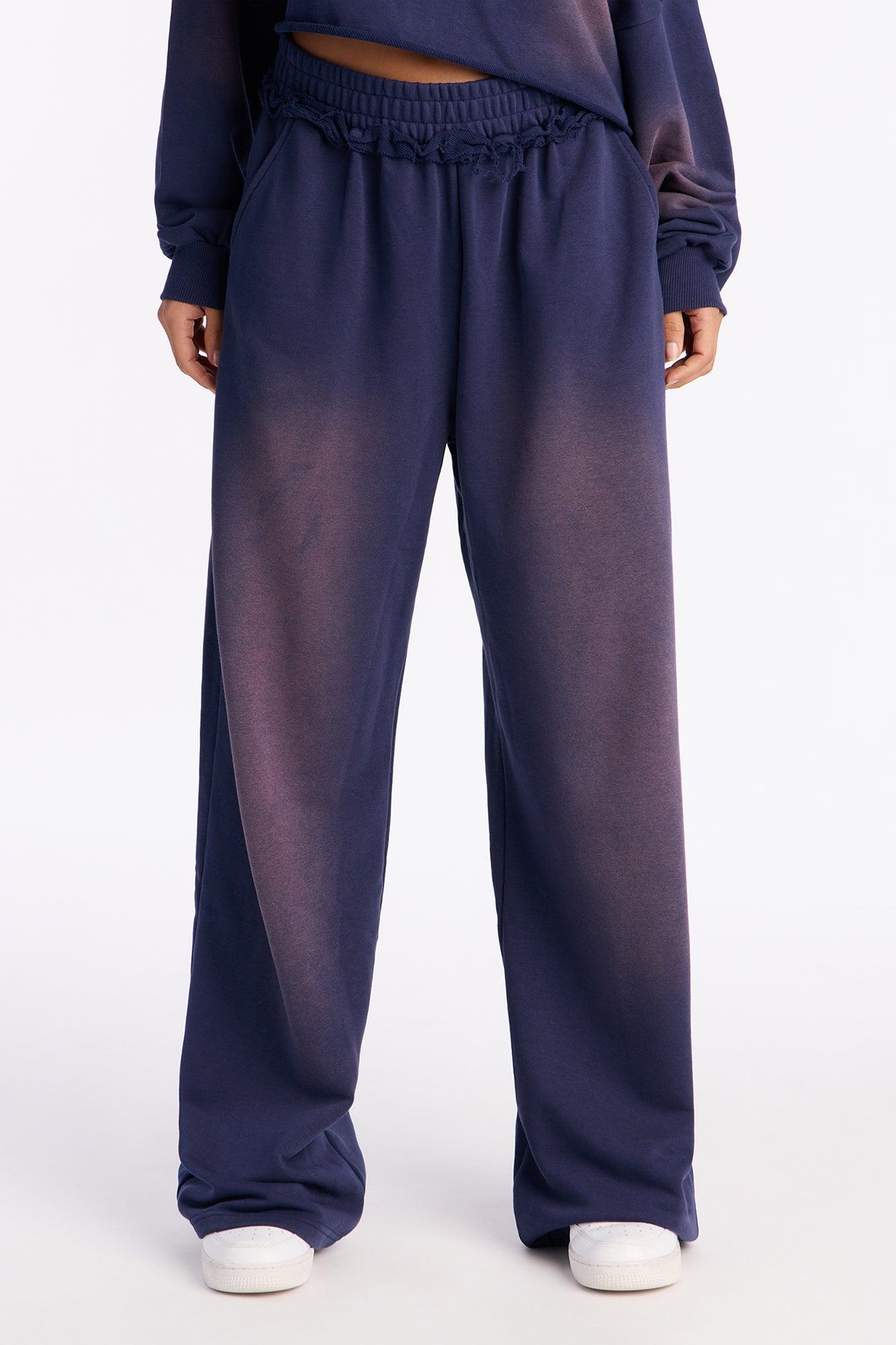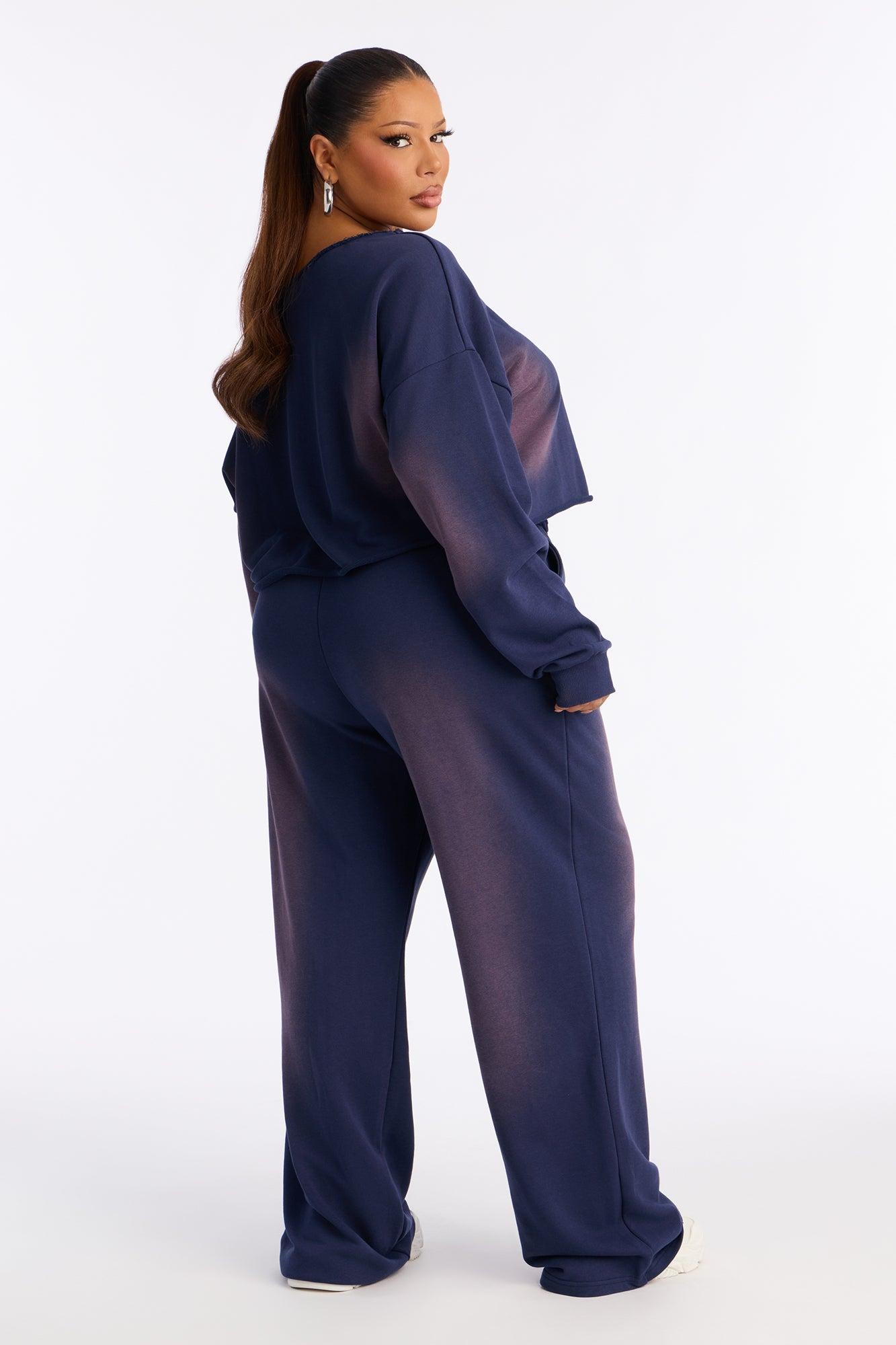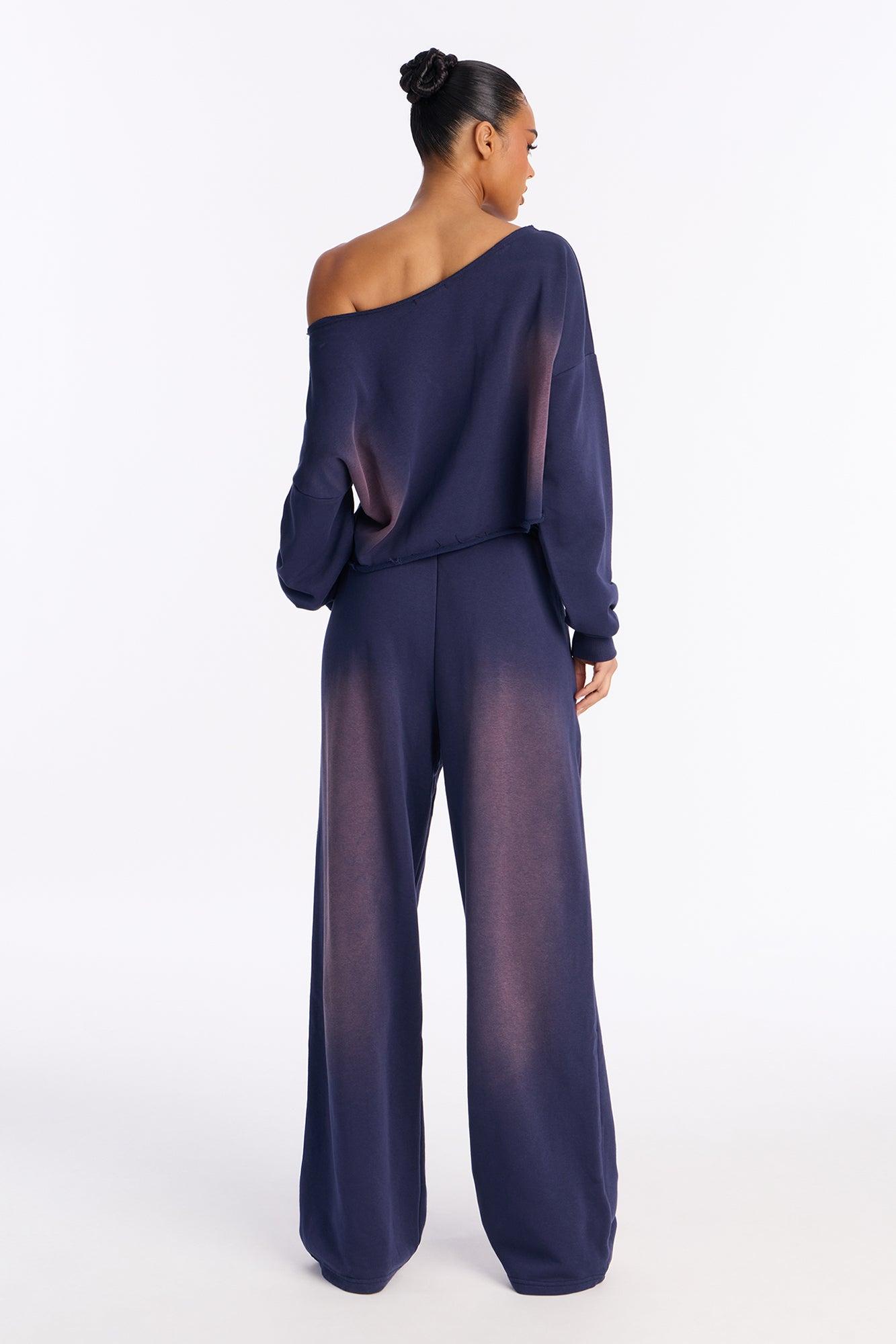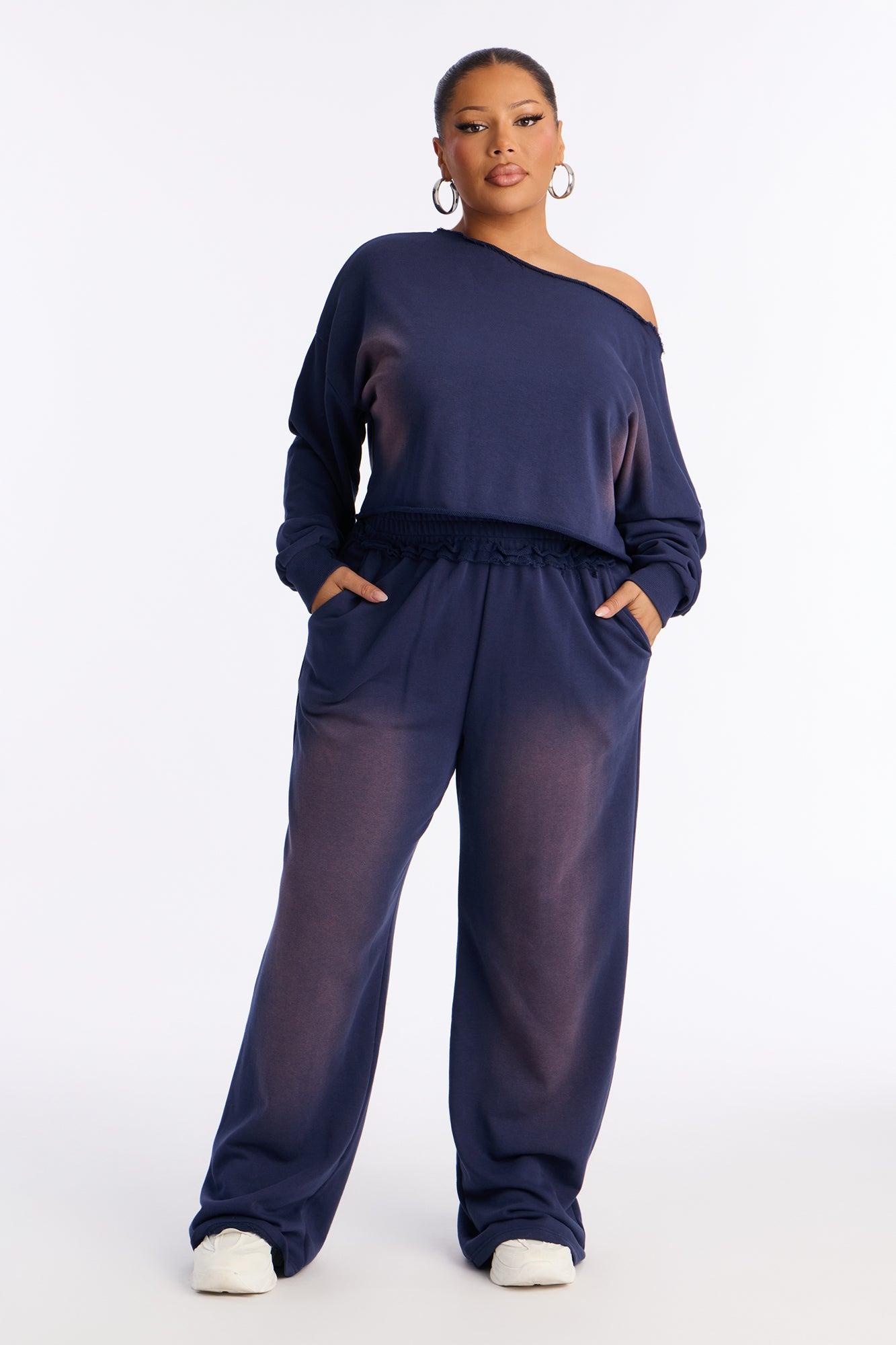 Available In Navy. Pants Elastic Waistband Washed Wide Leg 32" Inseam Pair With "Effortless Fade Washed Off Shoulder Sweatshirt" Disclaimer: Due To The Specialized Wash Process, Each Garment Is Unique. Self: 60% Cotton 40% Polyester Imported