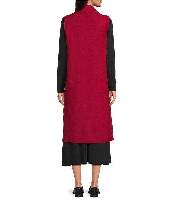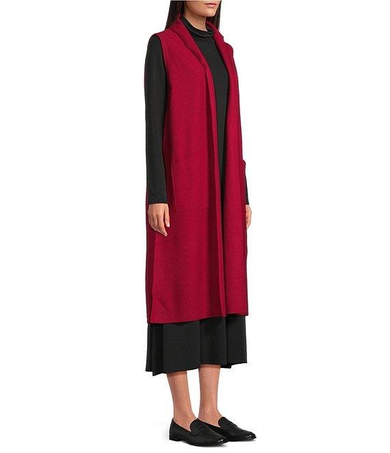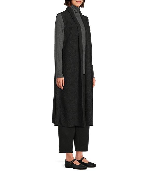 From Eilleen Fisher, this vest features: Lightweight boiled wool fabrication Best silhouette Shawl collar Sleeveless Patch pockets Straight hem Open front Approx. 44" length Wool Hand wash Imported.