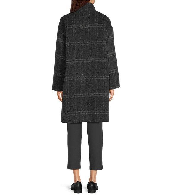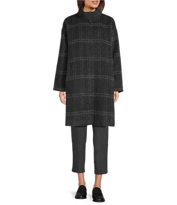 From Eileen Fisher, this coat features: Alpaca blend knit fabrication Windowpane pattern High collar neckline Long sleeves Side seam pockets Straight hem Button front closure Approx. 38" length Alpaca/wool/recycled nylon Dry clean Imported.