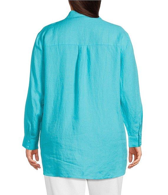 From Eileen Fisher plus, this shirt features: Organic linen fabrication Point collar neckline Long sleeves Round hem Button front closure Approx. 32.5" length Organic linen Machine wash Imported.