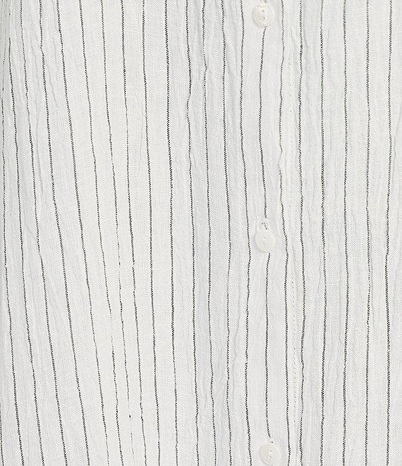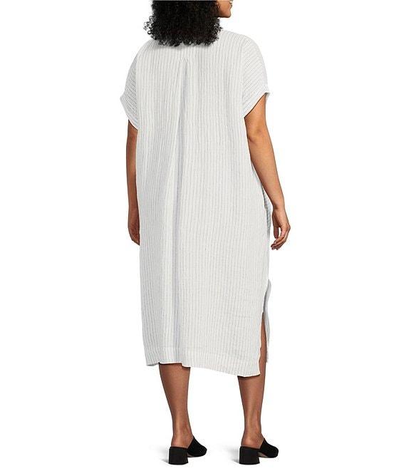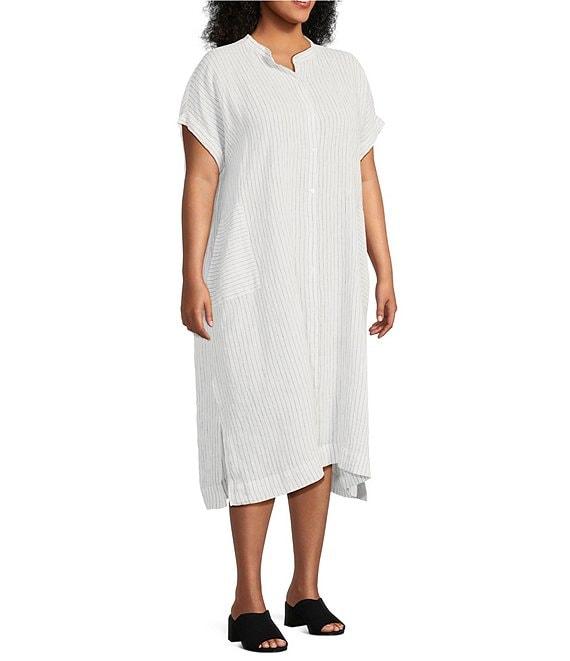 From Eileen Fisher Plus, this dress features: Puckered organic linen fabrication Stripe print Side slits on the bottom Mandarin collar neckline Short sleeves Straight hem Button front closure Approx. 47.5" length Organic linen Machine wash Imported.