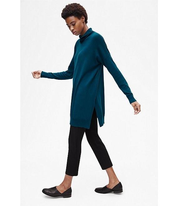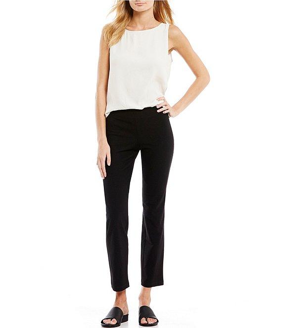 From Eileen Fisher, these pants feature: washable stretch crepe fabrication knit in France flat front; no pockets slim leg silhouette elasticized waistband ankle length pull-on construction approx. 28" inseam viscose/nylon/spandex machine wash Made in the USA of imported fabric.
