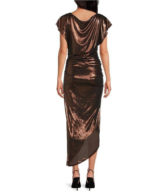 ELAN Boat Neck Cap Sleeve Side Slit Ruched Midi Dress