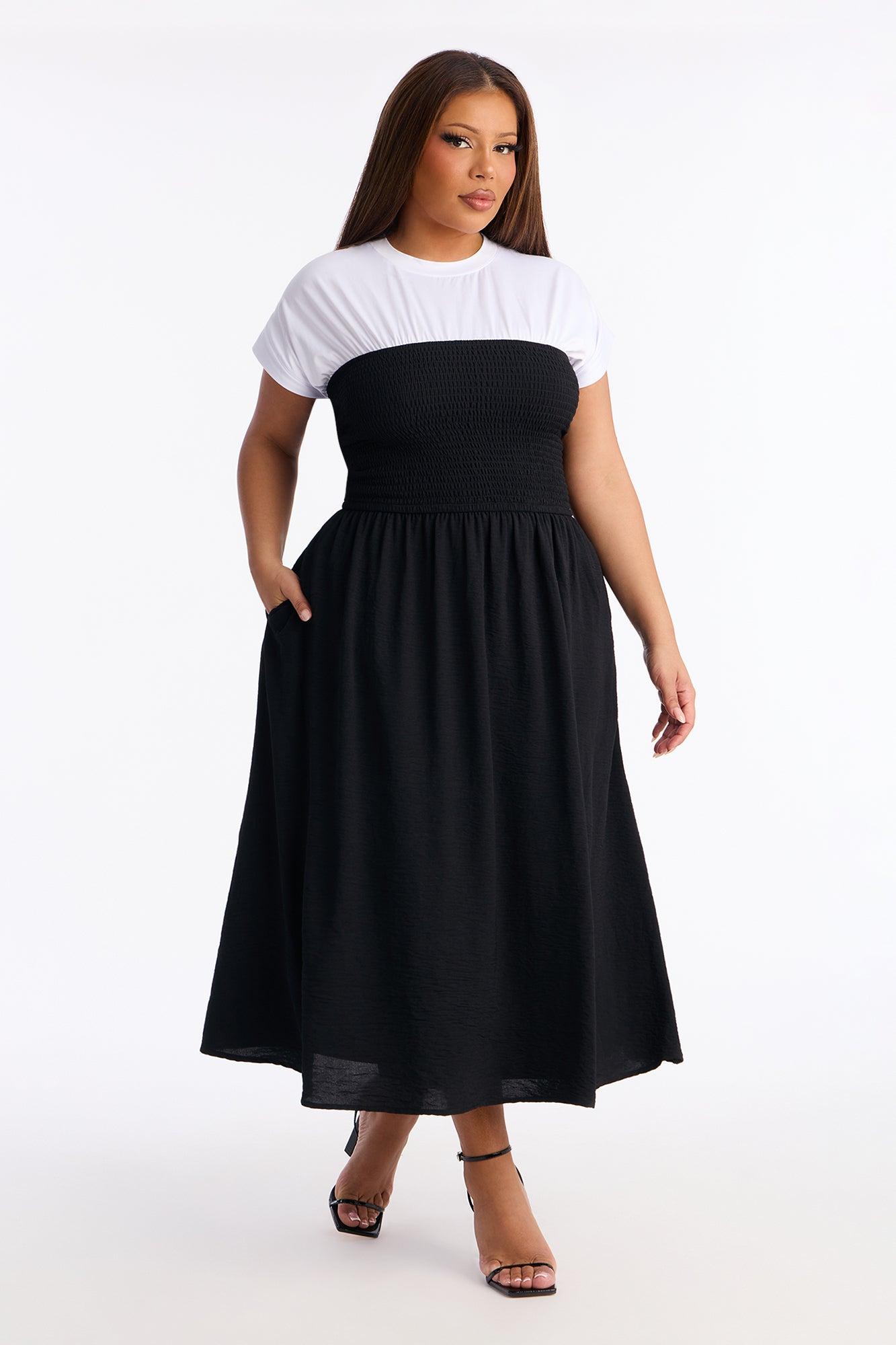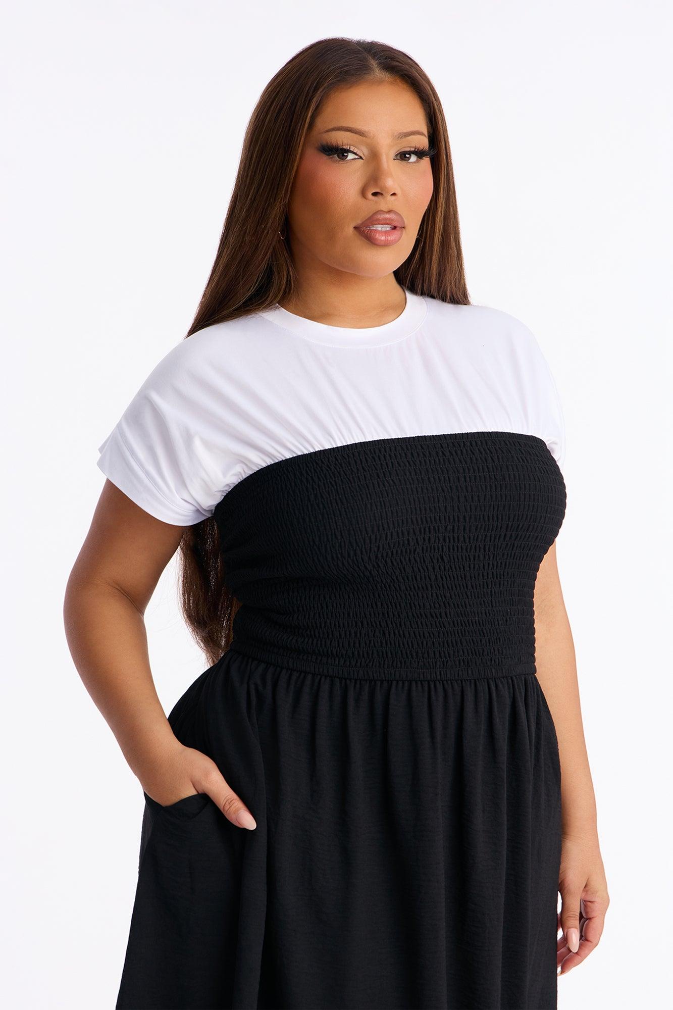 Available In Black/White. Midi Dress Crew Neckline Short Sleeve Cinched Waist Lined Stretch Length Measured Flat = 47" Self : 100% Polyester Contrast : 95% Polyester 5% Spandex Lining : 100% Polyester Imported