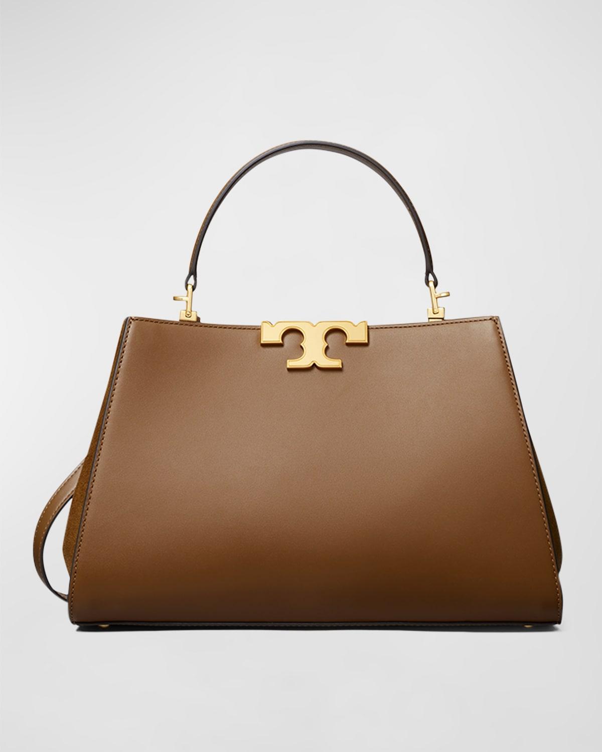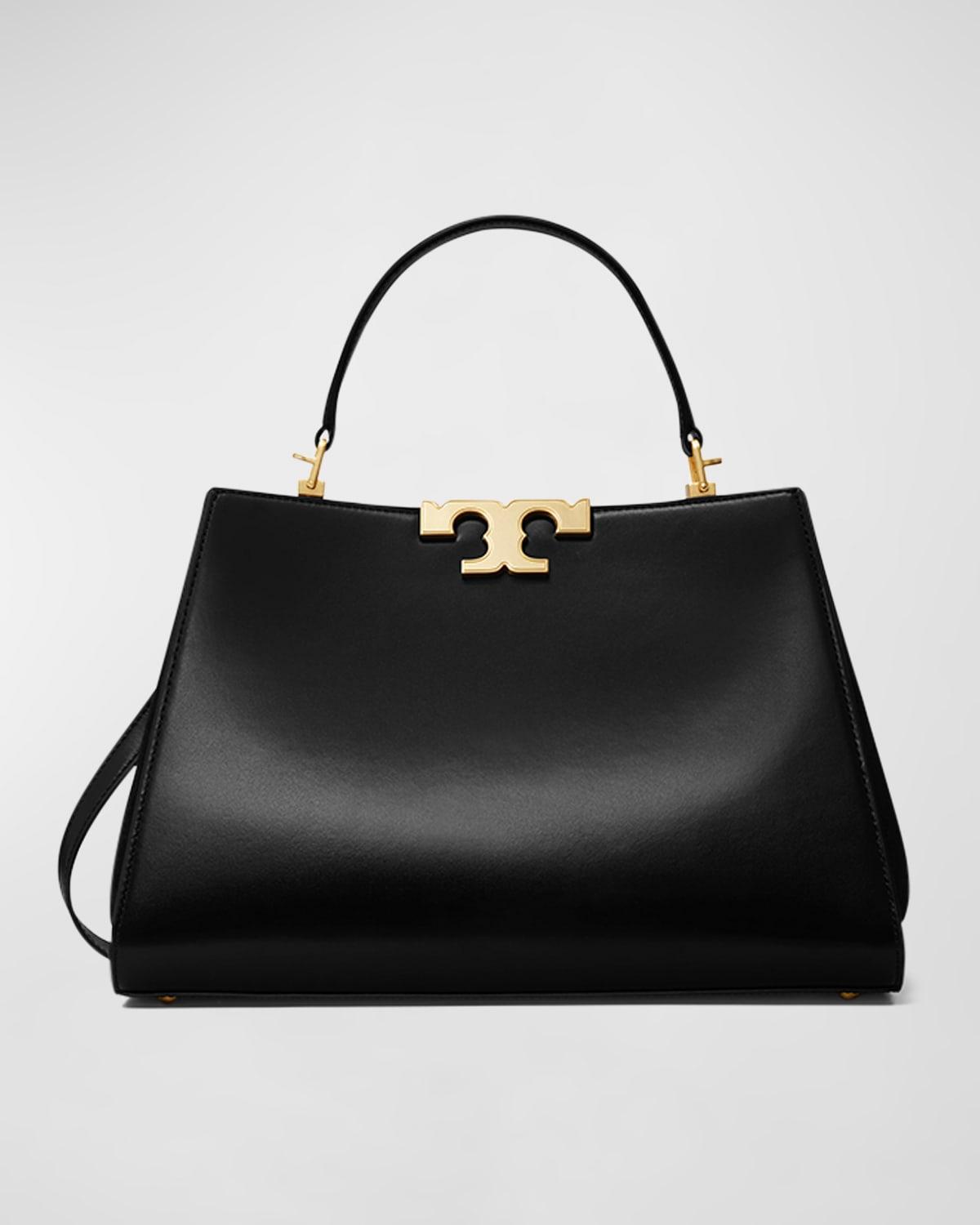The Eleanor satchel from Tory Burch is crafted of sleek leather with goldtone logo hardware. Top handle Adjustable, removable crossbody strap Interior: two compartments, one flap pocket Magnetic snap closure Leather Lining: 100% polyurethane Trim: suede Imported SIZE About 12.5W x 8.25H x 5D Top handle, about 5 drop Adjustable, removable crossbody strap, abotu 15.75 drop ABOUT THE BRAND Since debuting her brand in 2004, New York-based designer Tory Burch has made an impact on the fashion world with her handbags and shoes, and playful-yet-polished clothing. Today, Burch remains inspired by color and travel, with her vibrant collections bursting with prints, and her instantly recognizable double-T logo drawing from Moroccan architecture. Handbags - Tory Burch Handbags > Tory Burch > Saks Fifth Avenue > Barneys. Tory Burch. Color: Black.