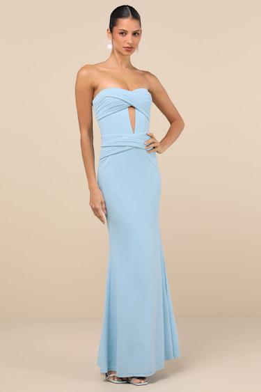 The most sensational moments will be created whenever you slip into the Lulus Elegant Finesse Light Blue Pleated Cutout Maxi Dress! Stretchy crepe knit shapes this gorgeous gown that features a strapless bodice with a sweetheart neckline (with hidden no-slip strips), pleated crisscrossing details, and a flirty cutout at the center. The same pleated detailing accents the high, fitted waist, atop a mermaid-style skirt that falls to a sweeping maxi hem with a sultry side seam slit. Hidden back zipper/clasp.