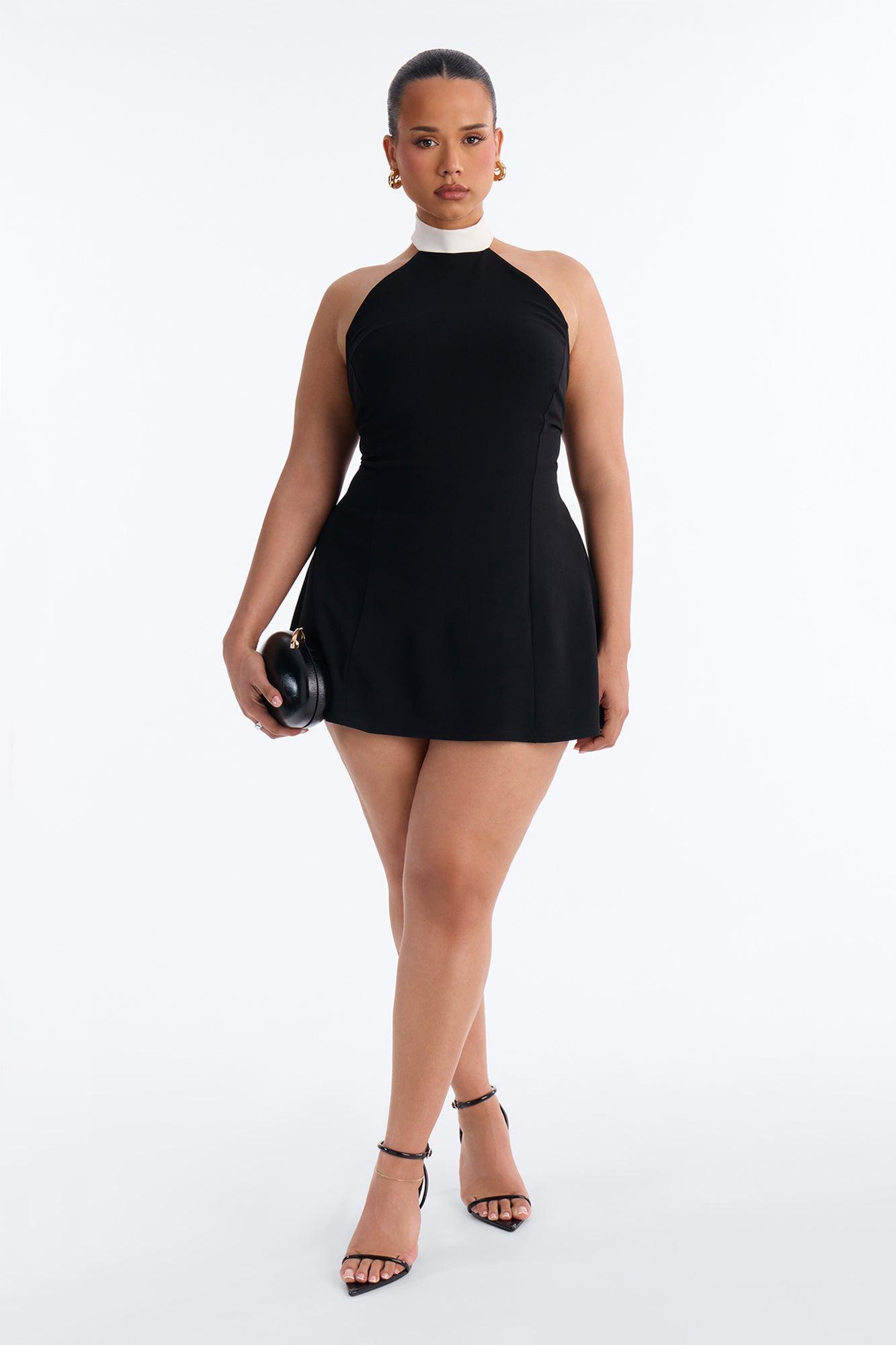 Available In Black/White. Romper Stretch Open Back Back Bow Detail Skort Final Sale Self: 95% Polyester 5% Spandex Contrast & Lining: 100% Polyester Imported California Proposition 65WARNING: Cancer and Reproductive Harm - www.P65Warnings.ca.gov.