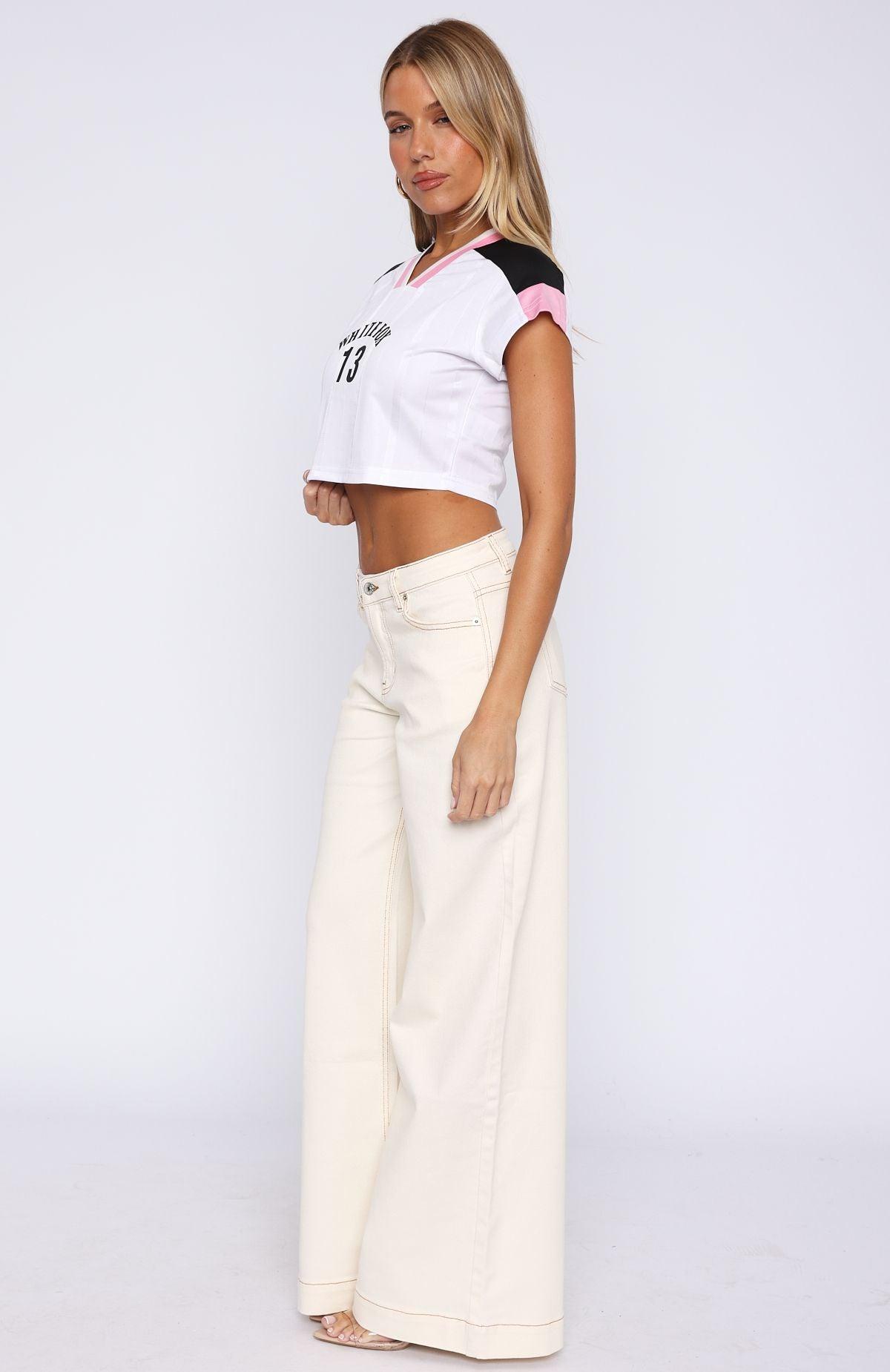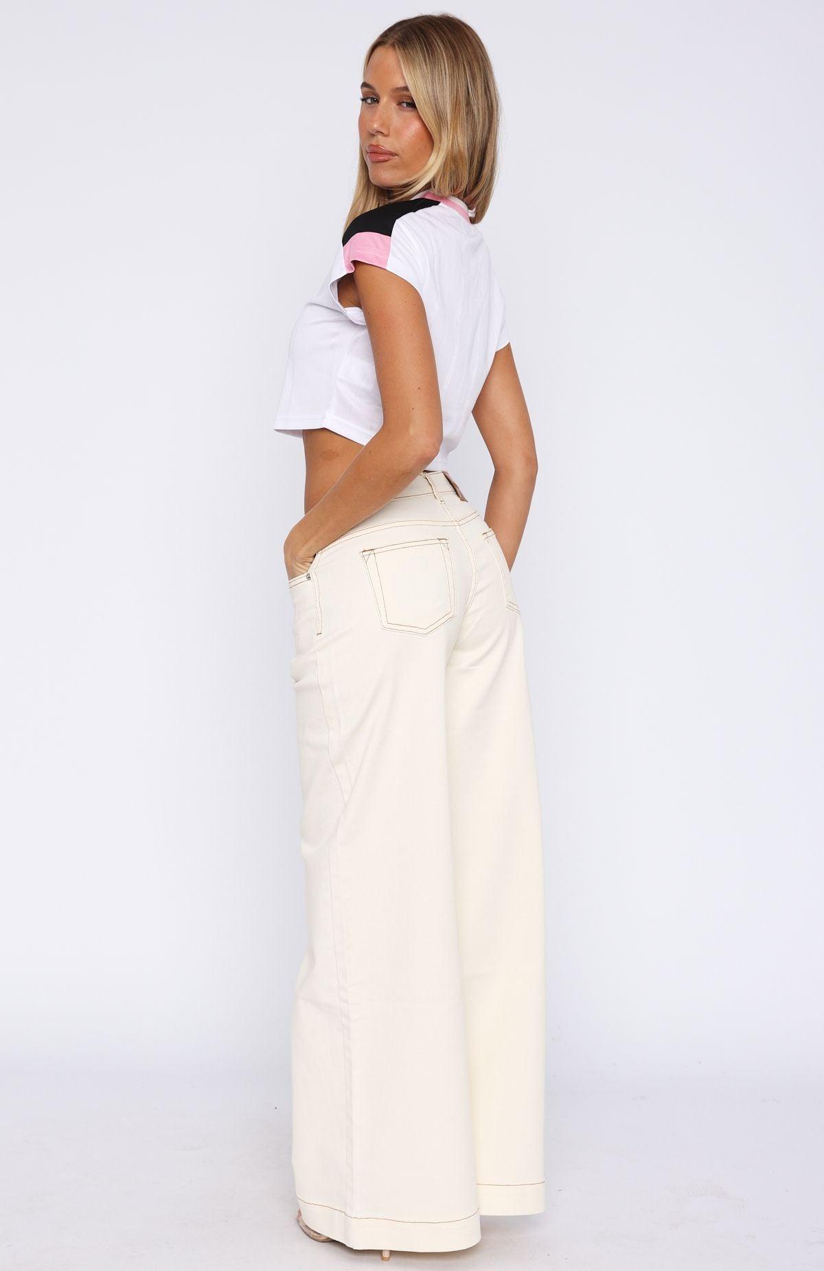 We are officially obsessed with the Elena Low Rise Wide Leg Jeans in Cream! Features low rise waist cut, button and zipper closure, 5 pockets, belt buckle holes, wide leg and White Fox Logo side back. Complete the look with a elevated basic and kitten heels for the perfect Sunday brunch look. 70% Cotton 28.5% Polyester 1.5% Elastane Sophie is 167cm & wears a XS Mik is 171cm & wears a S