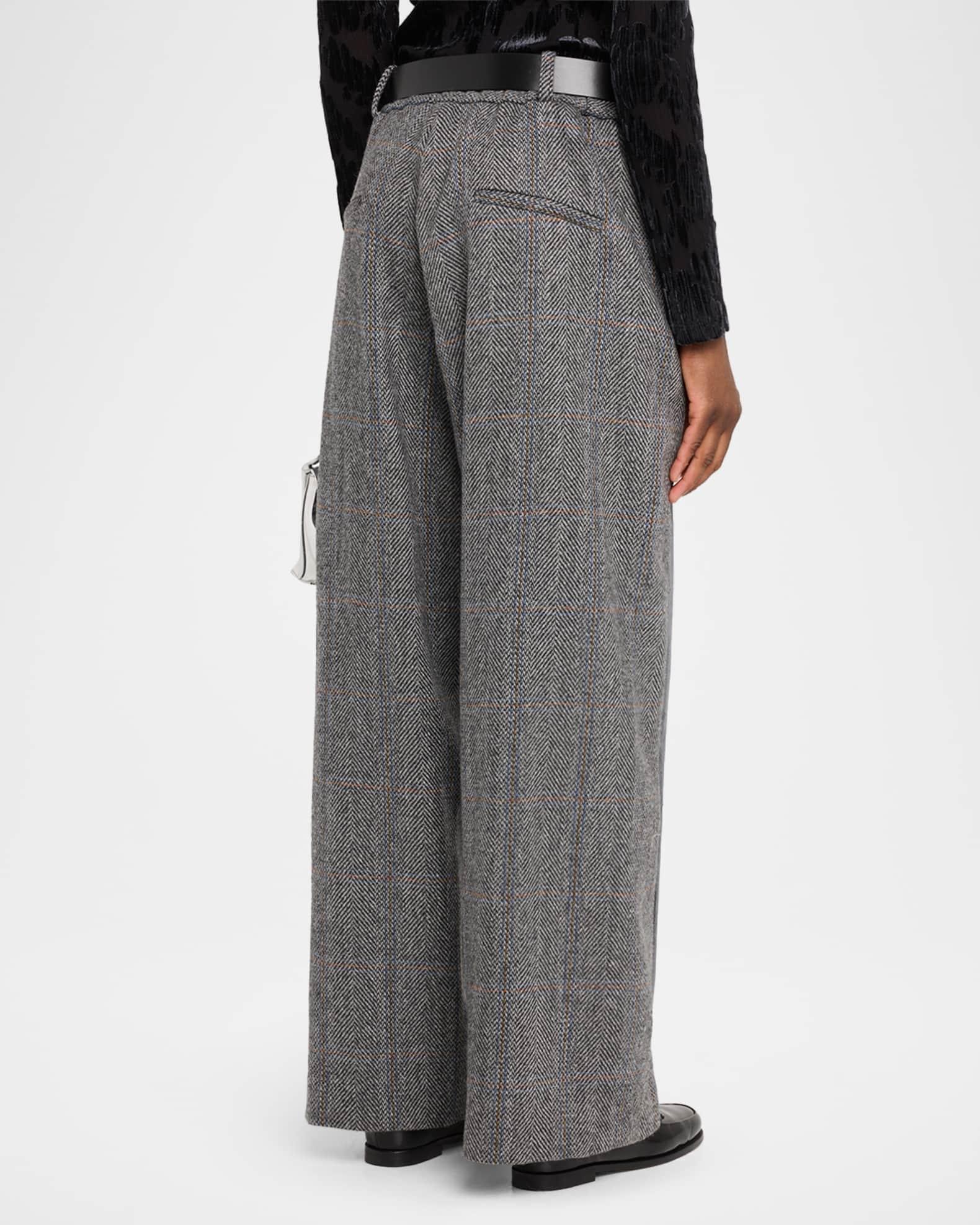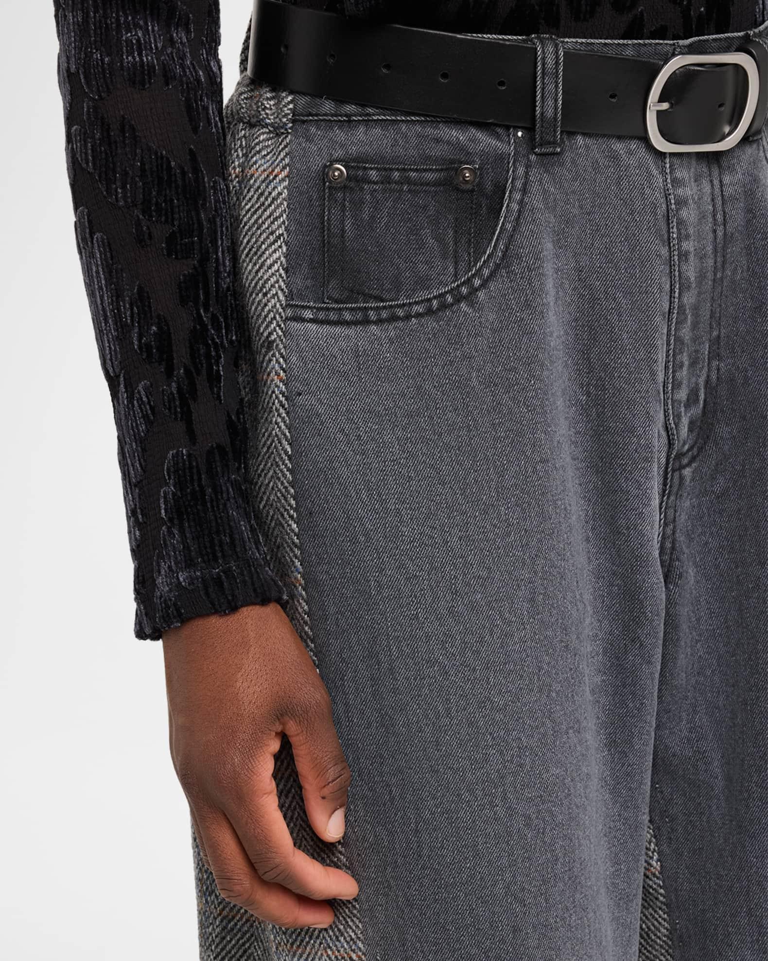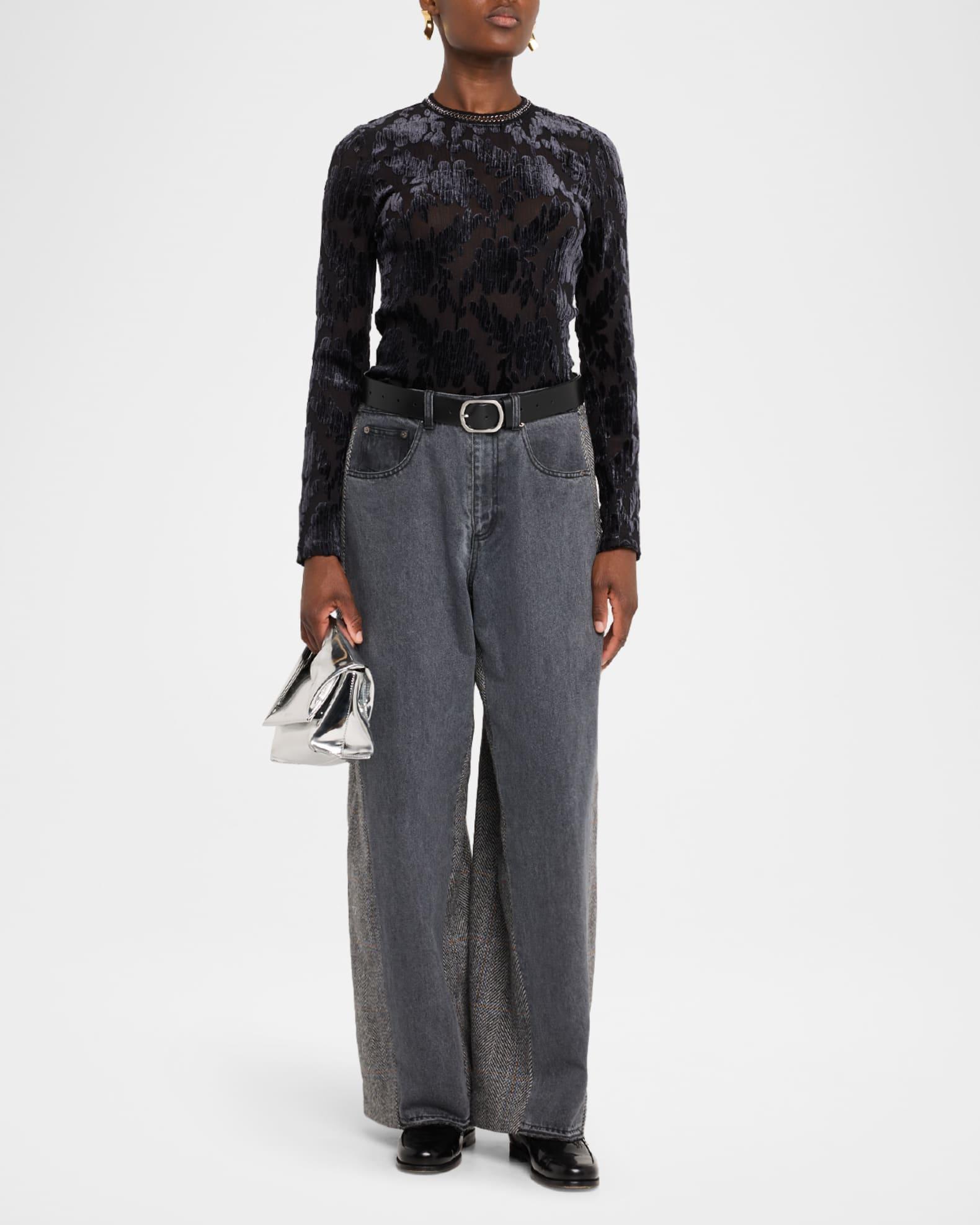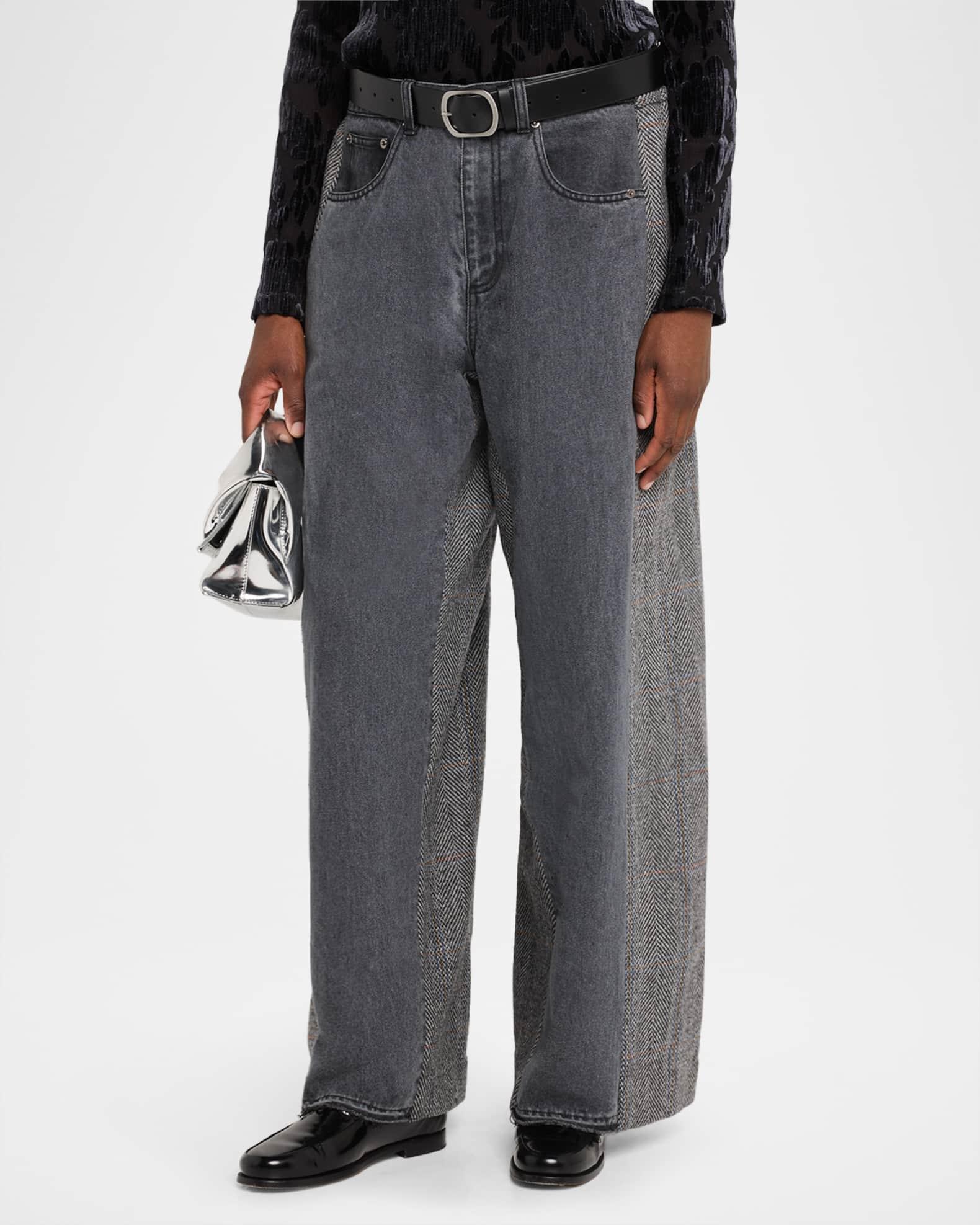 Sea "Eleni" combo jeans elevated with wool paneling and a belted waist Approx. 10.5" rise; 30.5" inseam; 15.4" outseam Mid-rise; sits high on the hip Front pockets; back welt pockets Relaxed, wide legs Full length Button/zip fly; belt loops Cotton/polyester/wool Dry clean Imported