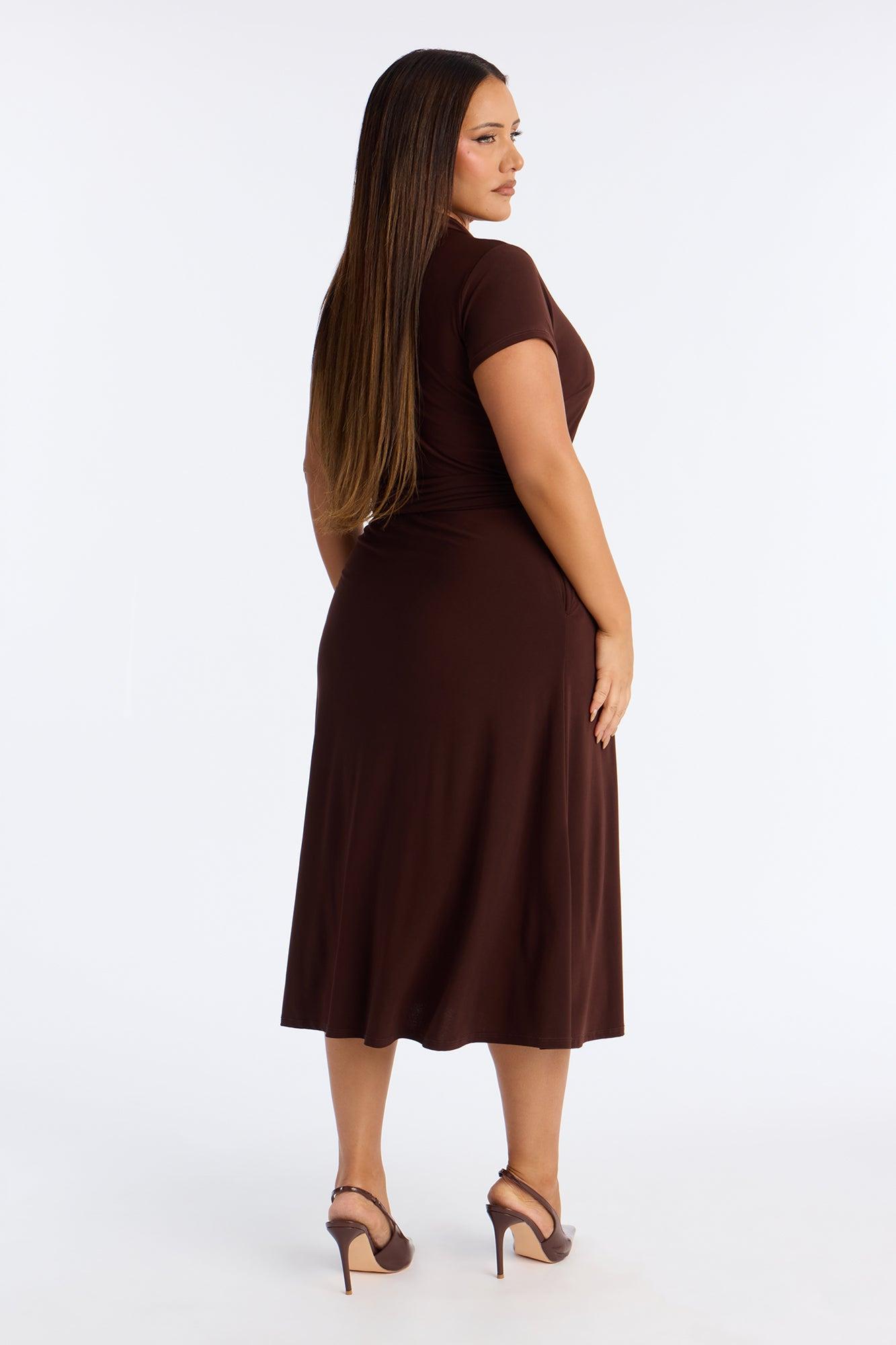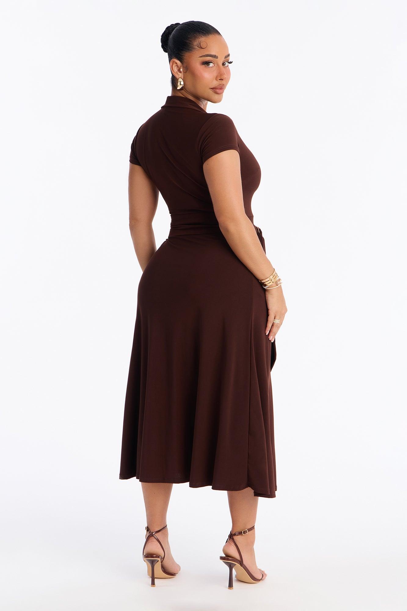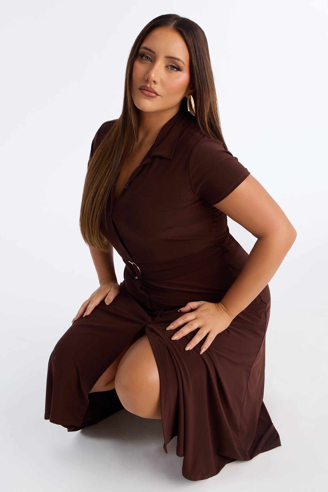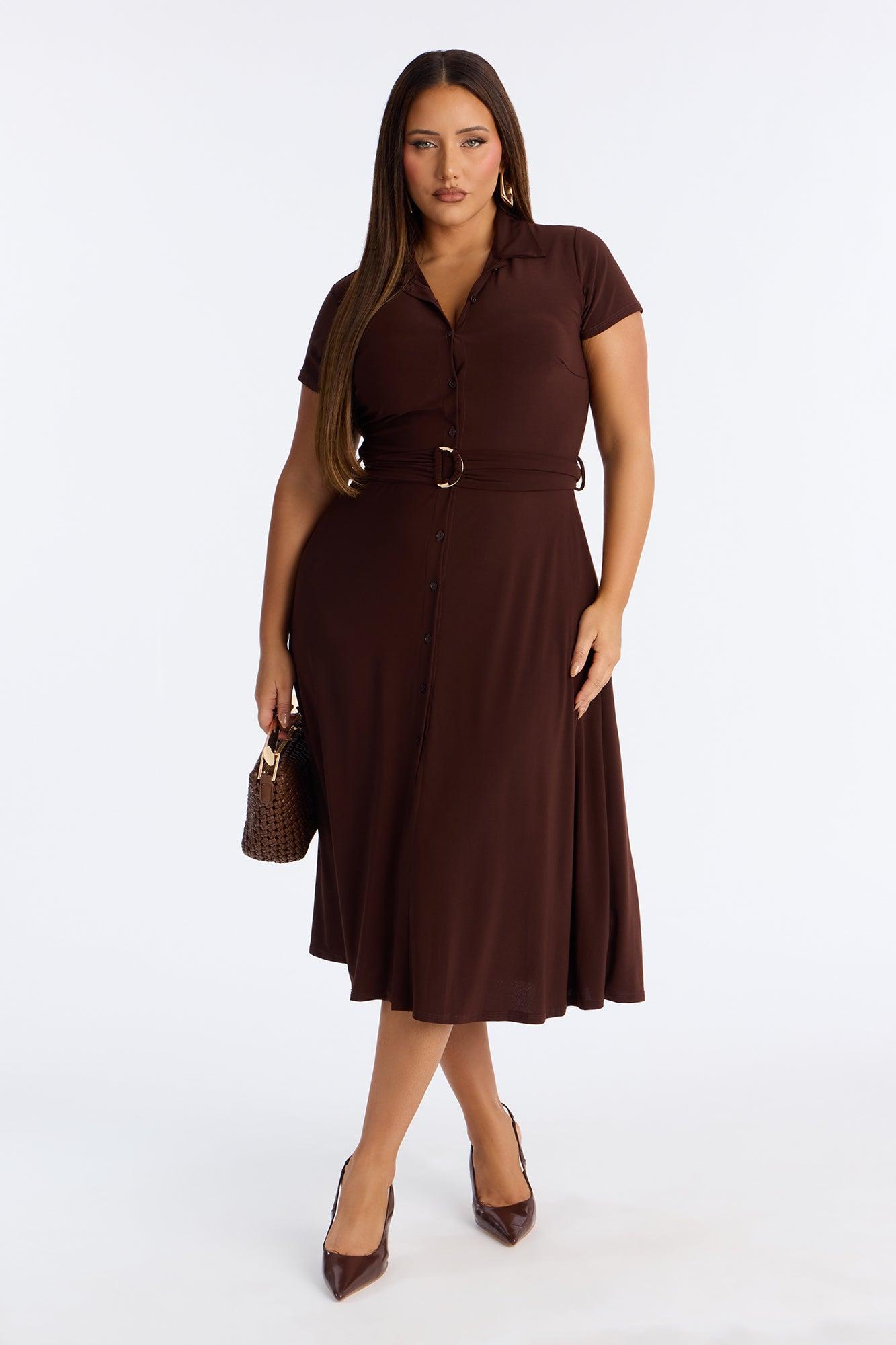 Available In Black And Chocolate. Button Up Midi Dress Collar neckline Short sleeves Button front Belted Stretch Length = 49" 95% Polyester 5% Spandex Imported California Proposition 65WARNING: Cancer and Reproductive Harm - www.P65Warnings.ca.gov.