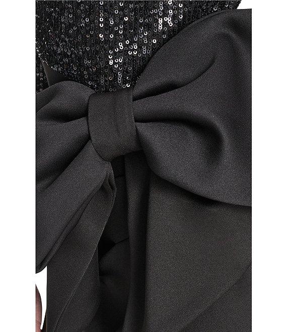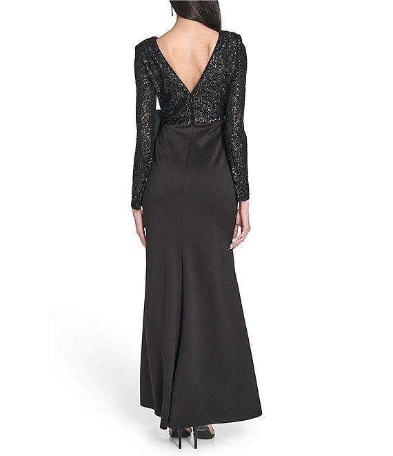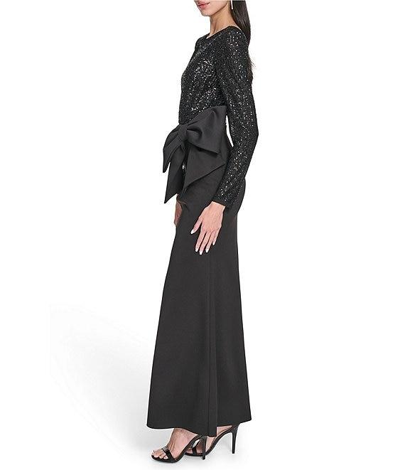 Eliza J Long Sleeve Sequin Waist Bow A-Line Gown
