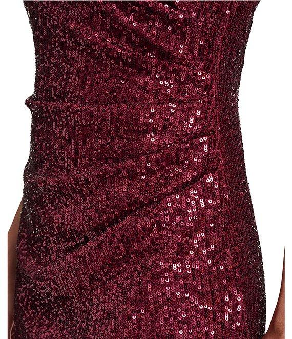 From Eliza J, this dress features: Sequin fabrication Sheath silhouette One shoulder Sleeveless Asymmetrical ruffle hem Zip back closure Approx. 42" length Polyester/Spandex Dry clean Imported.