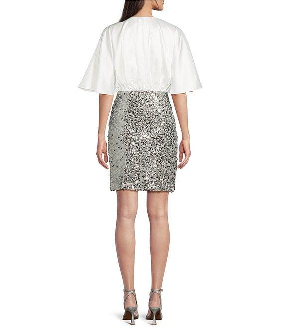 From Eliza J, this dress features: Satin bodice fabrication Paillette skirt Blouson v-neckline Elbow flutter sleeves Back zip clsoure Approx. 36" length Polyester Hand wash Imported.