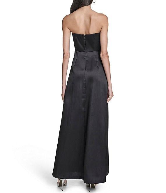 From Eliza J, this dress features: Mikado fabrication A line gown silhouette Strapless neckline Sleeveless Floral print Side zip closure Approx. 61" length Polyester Dry clean Imported.
