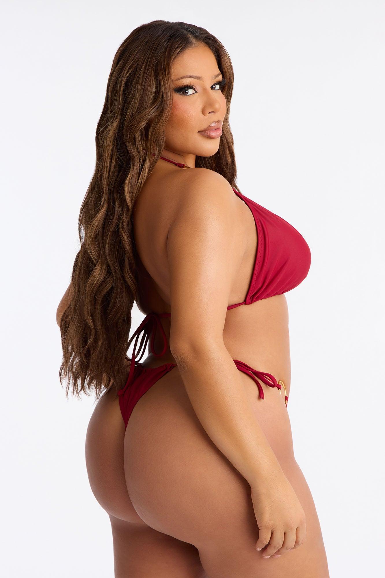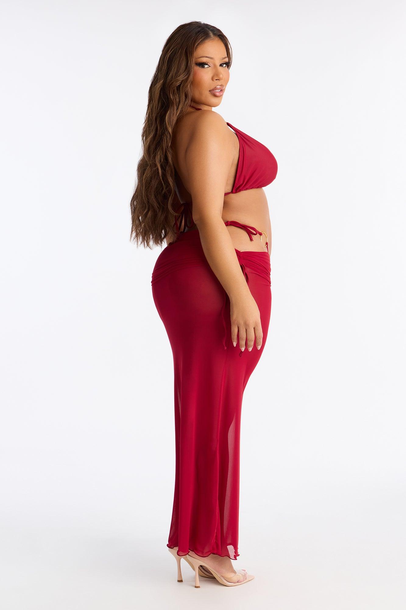 Available In Burgundy And Green. 3 Piece Bikini Set Adjustable Tie Straps Triangle Top O-Ring Detail Removable Cups Bikini Bottoms Matching Maxi Skirt Side Tie Ruched Detail Stretch Final Sale Top/Bottom Shell: 85% Polyester 15% Spandex Top/Bottom Lining: 95% Polyester 5% Spandex Mesh: 95% Polyester 5% Spandex California Proposition 65WARNING: Cancer and Reproductive Harm - www.P65Warnings.ca.gov.