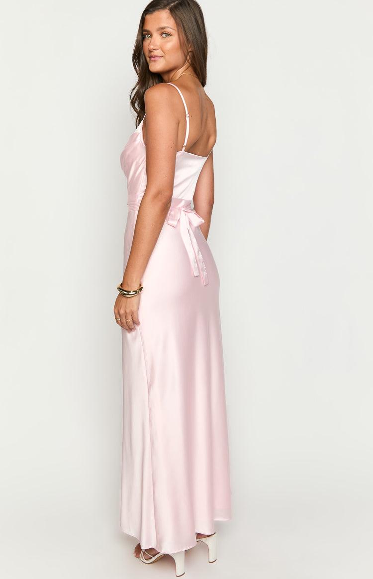 Pink Satin Cowl Neck Maxi DressHow to Style:Our Elma Pink Satin Maxi Dress is a beautiful choice for your upcoming prom, formal, or wedding event. Designed from luxurious satin with an elegant cowl neckline, this dress features a flattering bias-cut skirt and an adjustable wrap-tie waist. Complete this stunning look with delicate heels and a small handbag for a touch of timeless grace.Features: Maxi length Satin material Fully lined Side invisible zipper Adjustable straps Padded bust panel Cowl detail on front neckline Wrap style waist tie Bias cut skirt Perfect for proms, formals, and wedding guest attire!