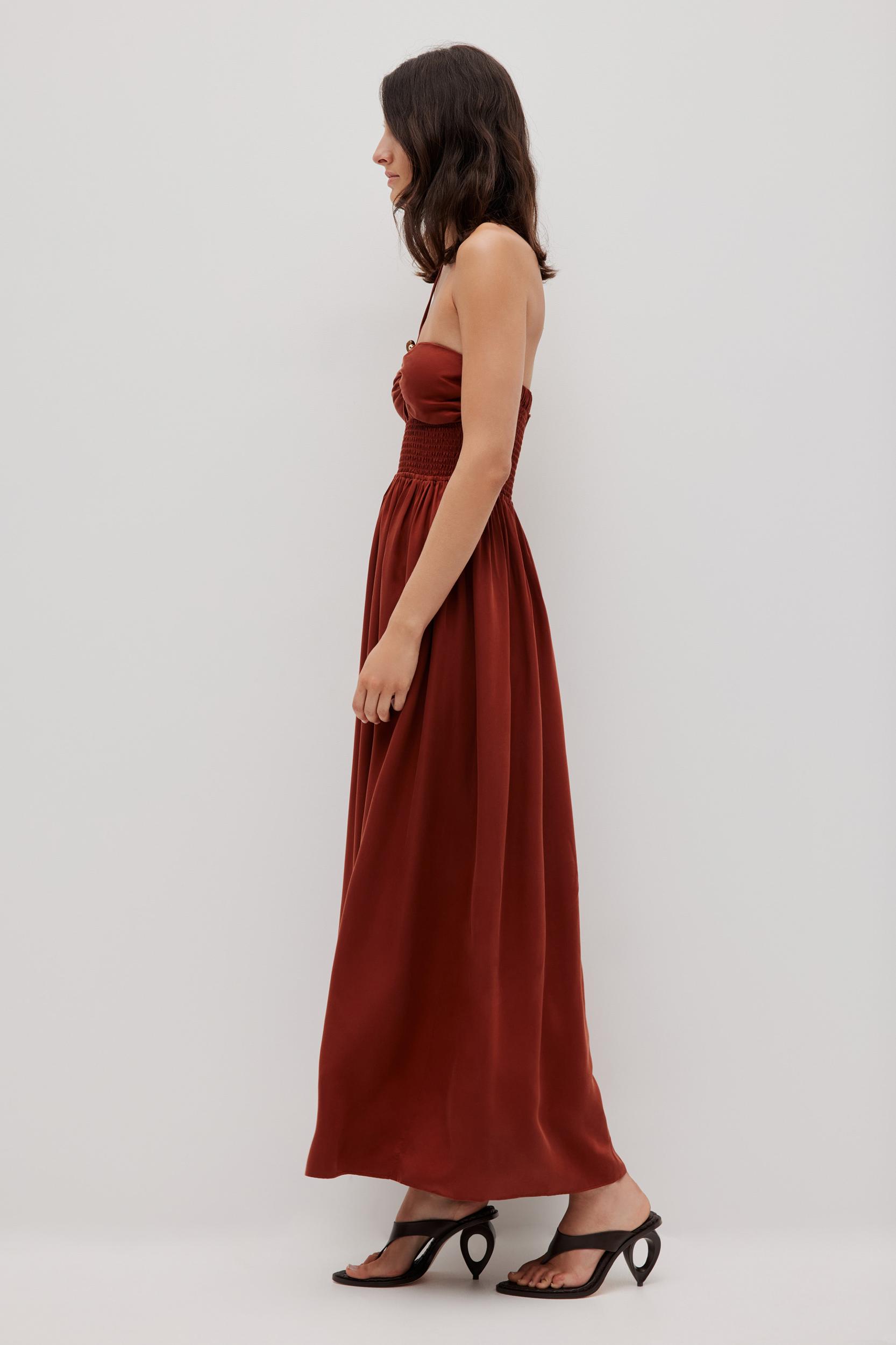 PRODUCT DETAILS Halter neck maxi dress Gold hardware at bust Gathered bust panels Rouleau straps with resin bead details Shirred underbust panel Shirred back panel Relaxed fit skirt Partially lined Pull on style 60% Lyocell, 40% Viscose Dry Clean Only Shop All Dresses SIZE AND FIT Model wears a size 8/S Model: 179cm/ 5’10 Bust: 82cm Waist: 64cm Hips: 88cm