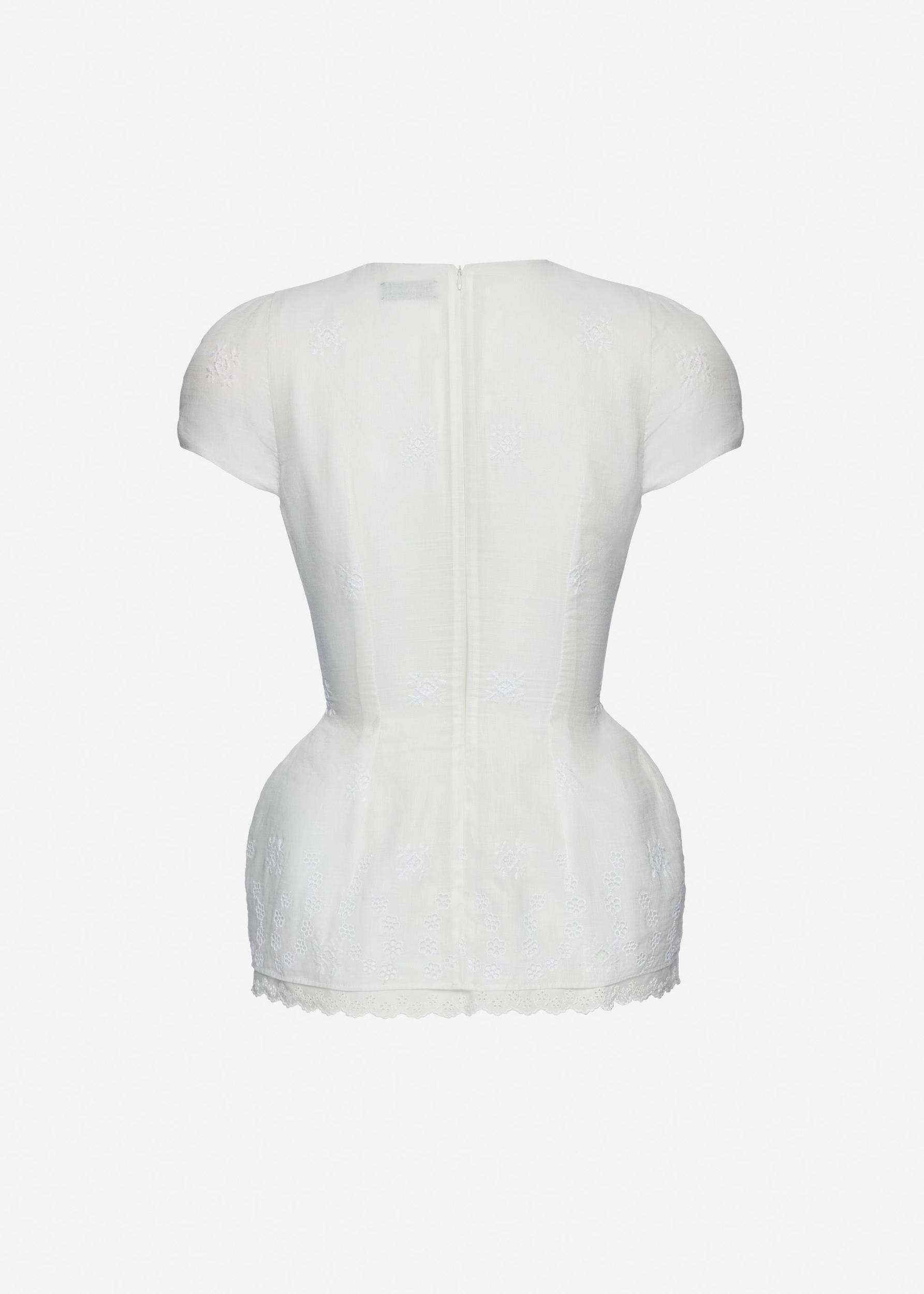 A fitted short-sleeve blouse crafted from a delicate blend of cotton and linen with subtle embroidery throughout. Designed with a round neckline and a defined waist shaped by precise darts. Light shoulder and hip padding create a sculpted silhouette. The piece is fully lined with an additional mesh layer finished in decorative lace, which subtly extends beyond the hem. Closes at the back with a concealed zip.