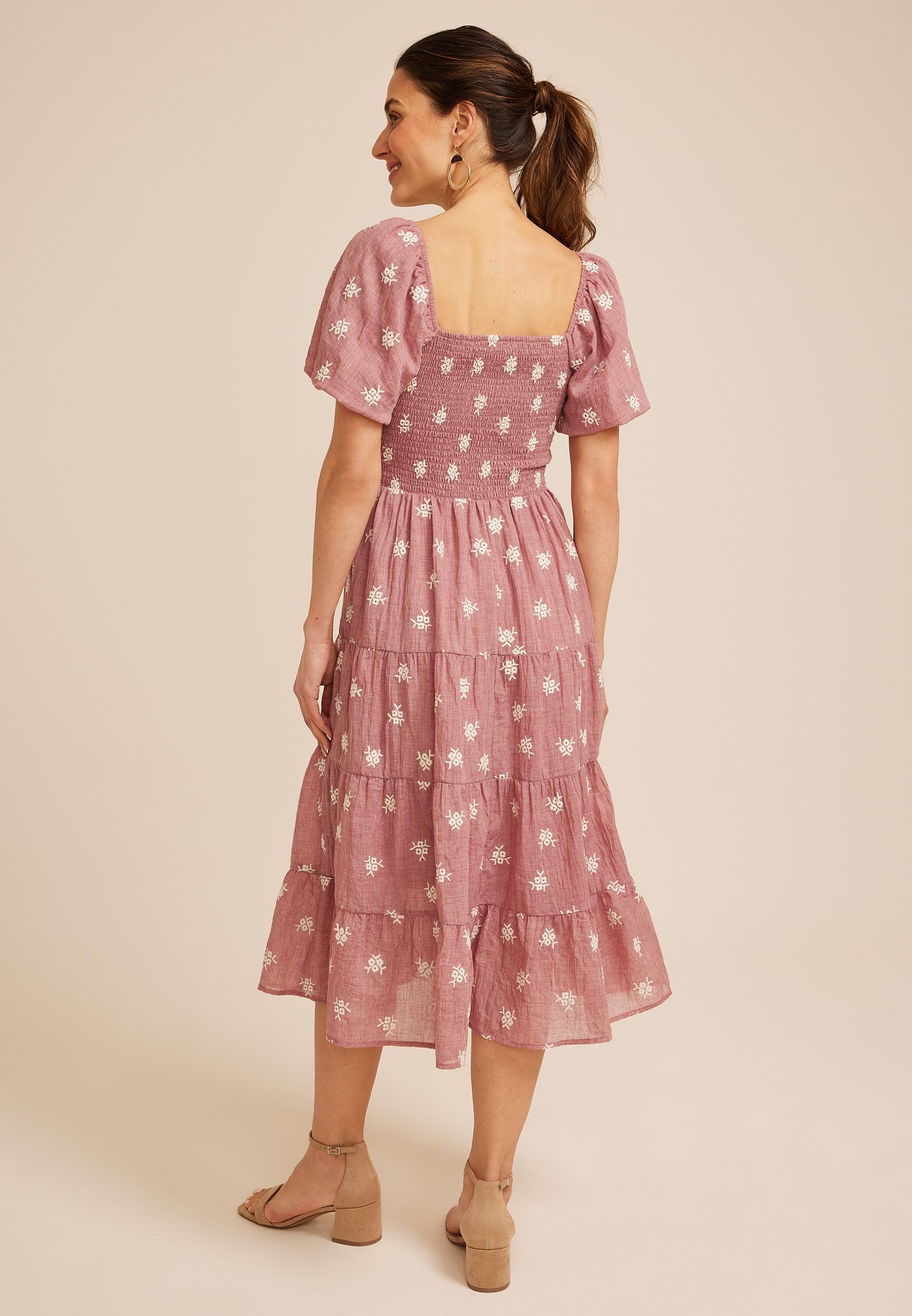 Softly romantic and endlessly wearable, this dress brings a vintage inspired charm to everyday moments with delicate embroidered florals, a gently smocked bodice, and a flowing tiered skirt that moves with effortless grace. The square neckline and puff sleeves add a feminine touch while the airy fabric keeps the look light and comfortable, making it perfect for sunlit afternoons, garden gatherings, and slow weekends when you want to feel beautiful without trying too hard. .mar-pdp-section .mar-product-description {color: #000;}.mar-pdp-section .mar-product-description ul, .mar-pdp-section .mar-product-description ul>li {margin-left: 10px;padding-left: 10px;}.mar-pdp-section .mar-product-description .mar-product-description-content ul li{list-style-type: disc;margin: 0 0 5px;padding-left: 5px;}.mar-pdp-section .mar-product-description p {color: #000;padding: 5px 0;}@media only screen and (max-width: 1023px){.mar-pdp-section .mar-product-description .mar-product-description-content ul li{list-style-type: disc !important;} .mar-pdp-section .mar-product-description .mar-product-description-content .mar-tab-content ul{padding-left: 10px;}.mar-pdp-section .mar-product-description .mar-product-description-content .mar-tab-content {font-weight: 300;}} Features: lightweight fabric embroidered floral pattern square neckline fully smocked bodice offering comfortable stretch while sculpting the waist into a flattering shape that feels secure effortless easy to wear all day lined skirt providing added comfort short puff sleeves multi tiered midi length skirt designed for airy sweeping movement midi length falling below the knee