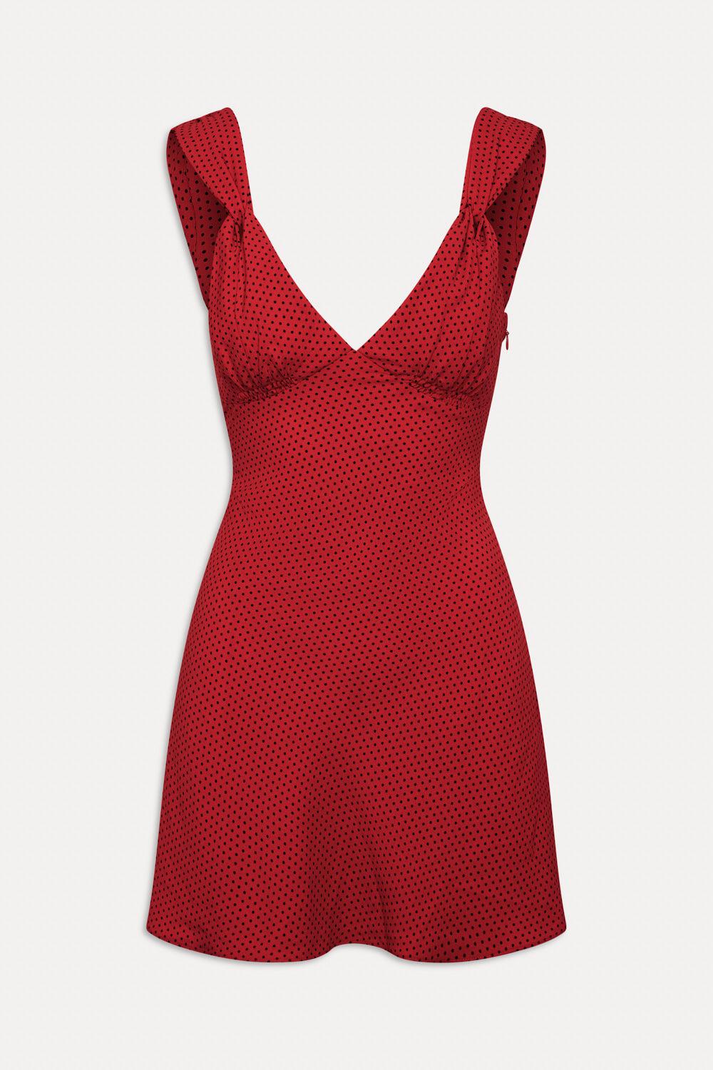 The Emilia mini dress is made for dancing after dark. Designed in a lightweight dress fabric, this silhouette flatters from every angle. Emilia features shoulder straps that fall into a cascading cowl and an open back that leaves a lasting impression. Details Red and black polka dot print Mini dress length