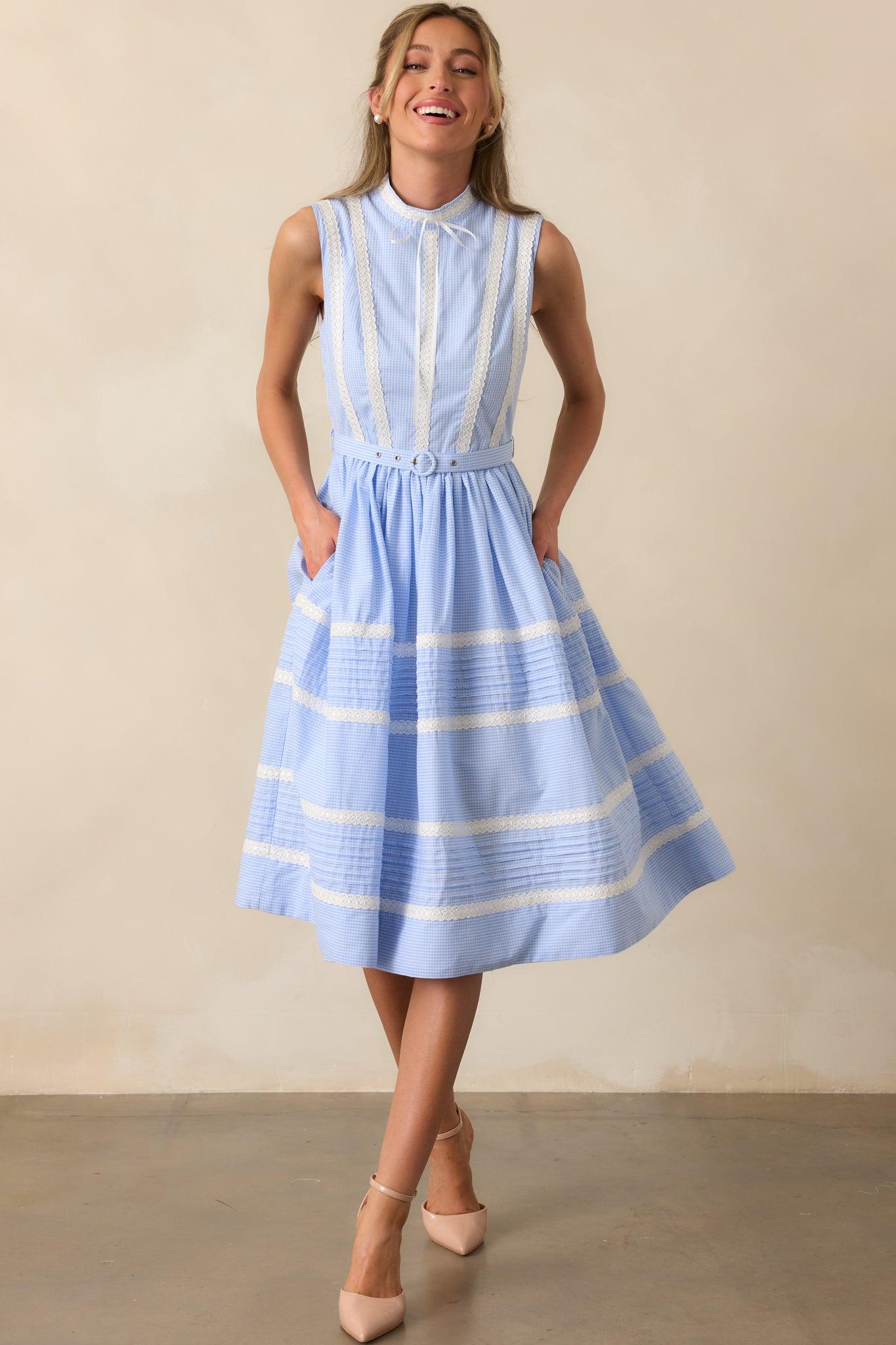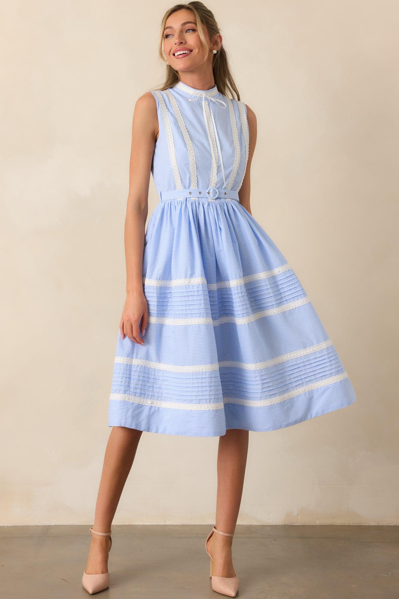 The Emma Blue Micro Gingham Cotton Ribbon Trim Dress evokes a sense of classic charm and timeless sophistication. Its vintage-inspired design makes it perfect for creating effortlessly elegant looks, whether for casual outings or special occasions that call for a touch of nostalgia. This blue dress features a mock neckline with a center bow detail, lace ribbon rows throughout, optional matching belt, hidden back zipper closure, sleeveless design, micro-gingham print, and midi length.