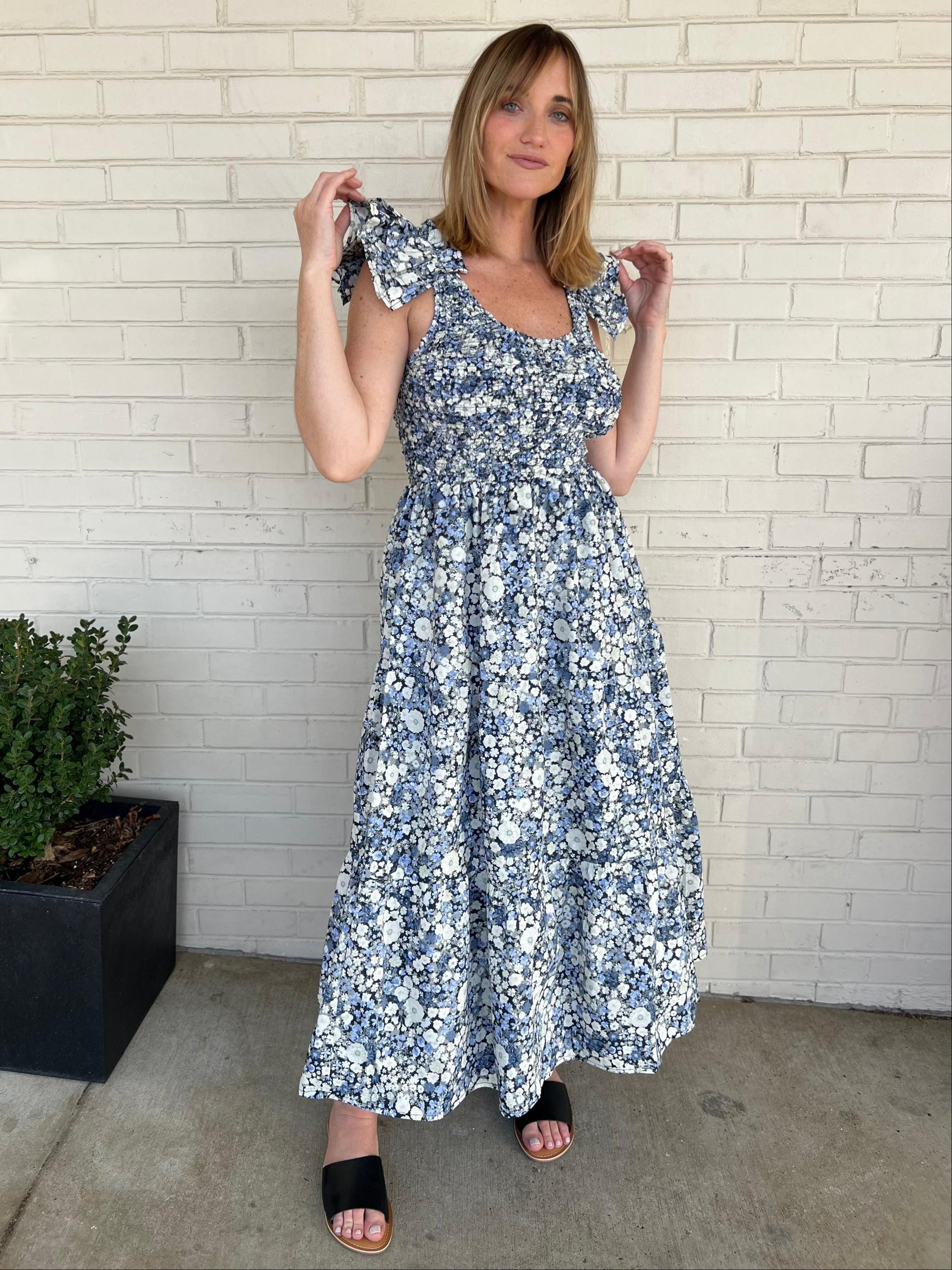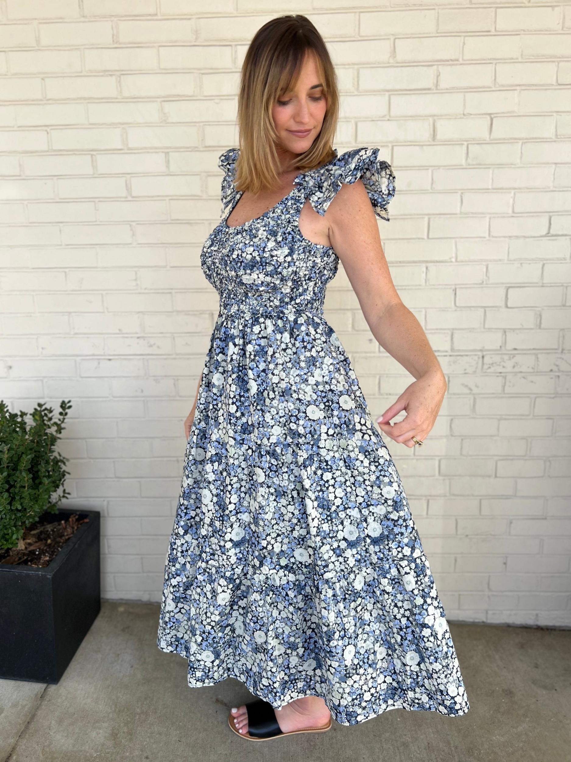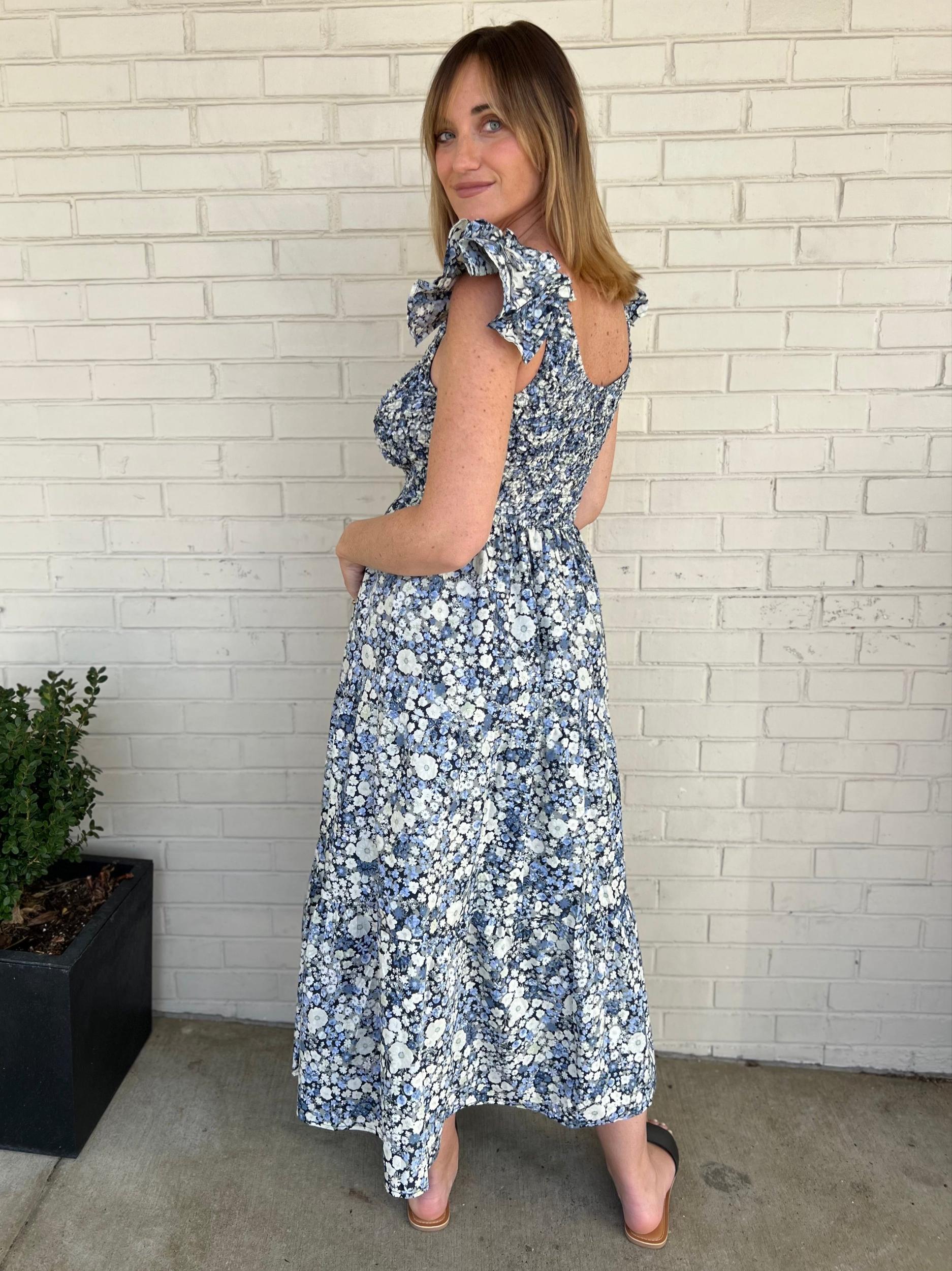 Be blooming in blue with the Emmy Midi Dress. Flutter through your day with flutter sleeves, a scoop neckline, and smocked bust for a flattering fit. The flowy skirt adds a touch of whimsy to this blue floral midi dress. Perfect for any occasion!