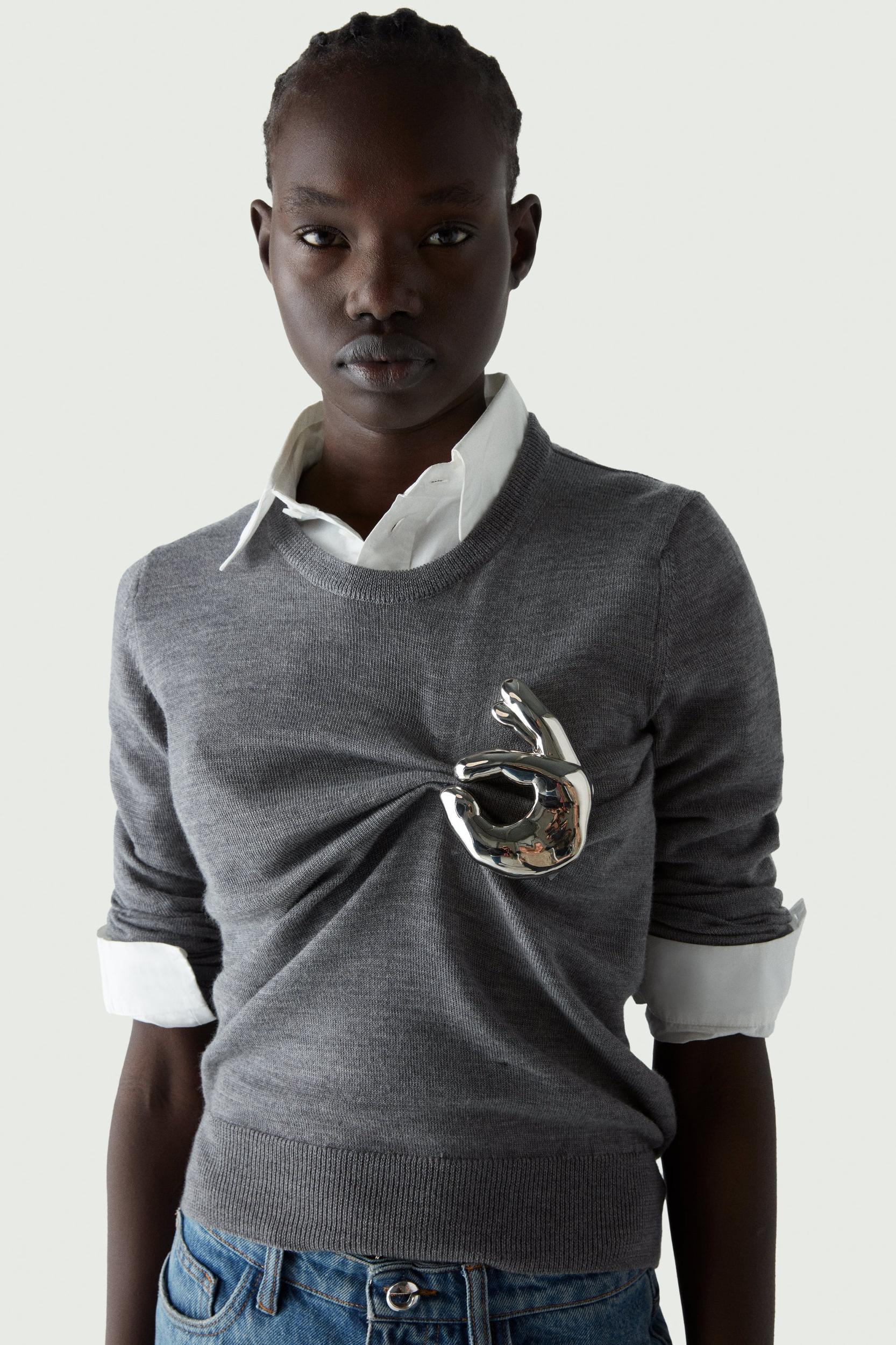 Adding a playful and irreverent edge to a classic pure wool grey knit, is this silver-toned emoji 'ok' sign. The detachable brooch is crafted in a special jewellery atelier in Italy. It appears to clasp the material, which is gathered in a twist for a close fitting style.