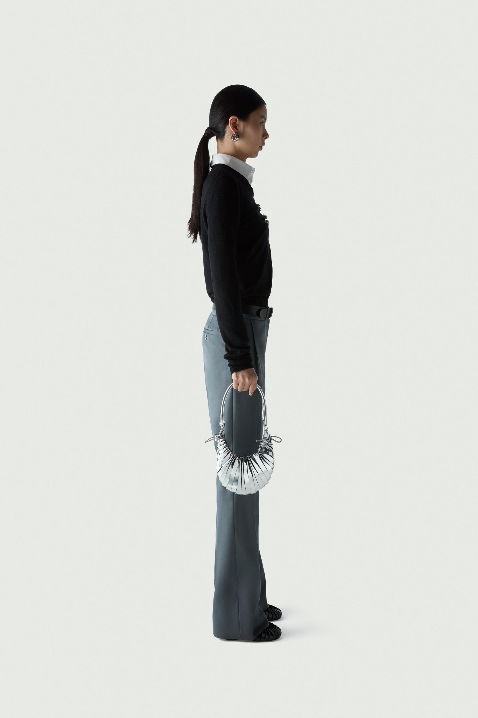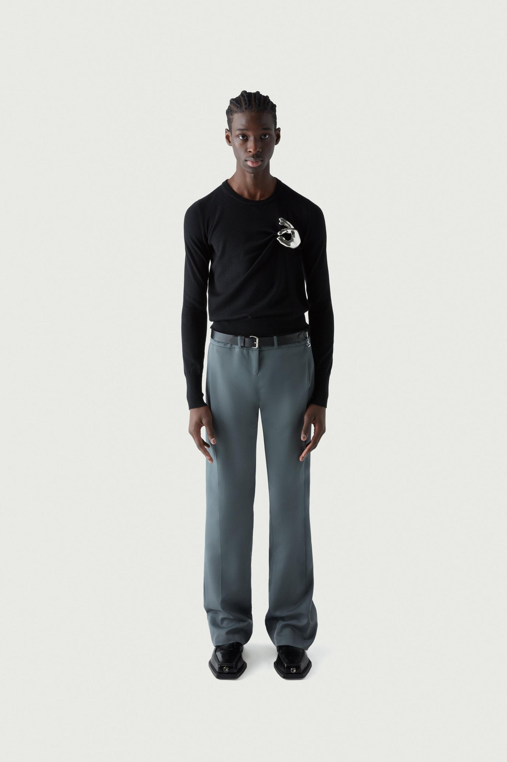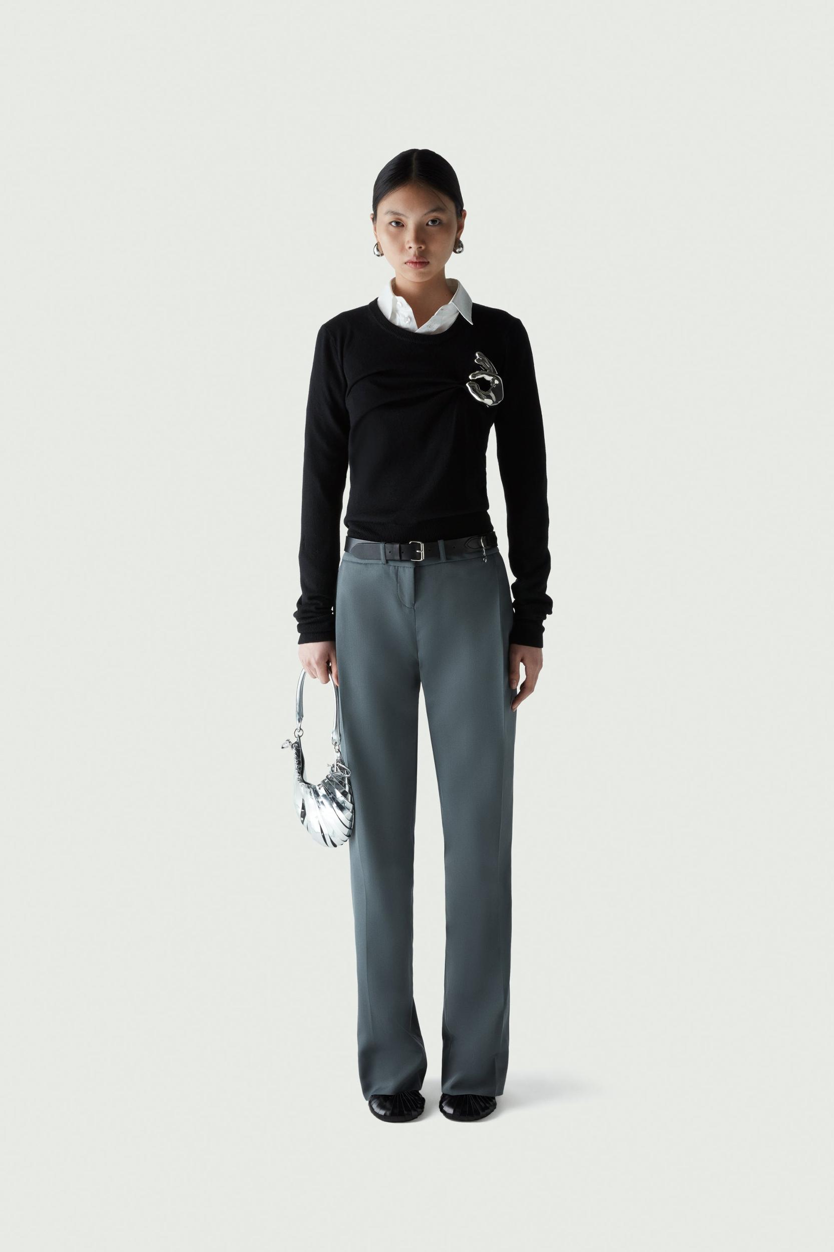 Adding a playful and irreverent edge to a classic pure wool black knit, is this silver-toned emoji 'ok' sign. The detachable brooch is crafted in a special jewellery atelier in Italy. It appears to clasp the material, which is gathered in a twist for a close fitting style.