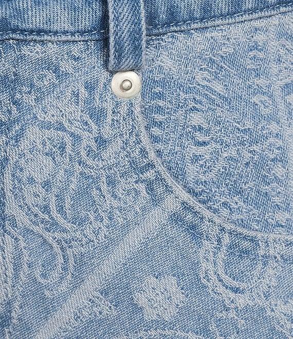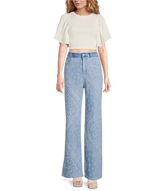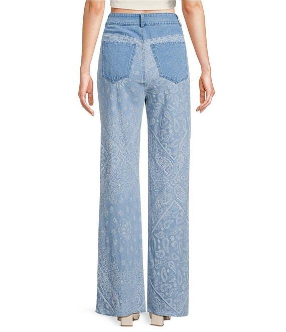 From En Saison, these jeans feature: Denim fabrication Embossed paisley print High Rise Straight Leg Loose silhouette Button/zip closure Front and back pockets Approx. 33.5" inseam, 10.75" front rise Cotton/polyester Handwash/line dry Imported.