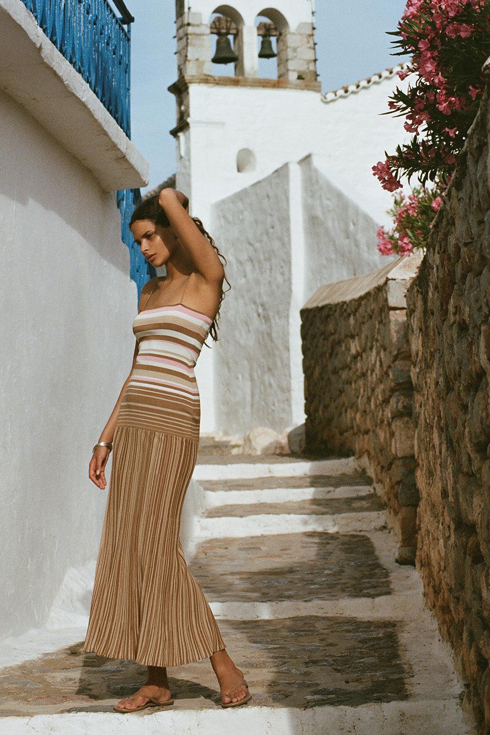 A new iteration of the beloved Citara silhouette, it is a midi dress with a straight neckline and thin straps, adjustable in length. Designed from a uniquely ribbed true knitwear fabrication, blending 100% organic cotton and nylon in a signature neapolitan stripe with pink and brown tones, inspired by nostalgic summers of childhoods past, it is fitted through the body before flaring into a soft skirt, cropping above the ankles. Style with a simple sandal for a FAITHFULL approach to summer occasionwear. This style is true to size. As there is elastane woven through the true knitwear fabrication, it offers some additional stretch. Wear over neutral intimates.