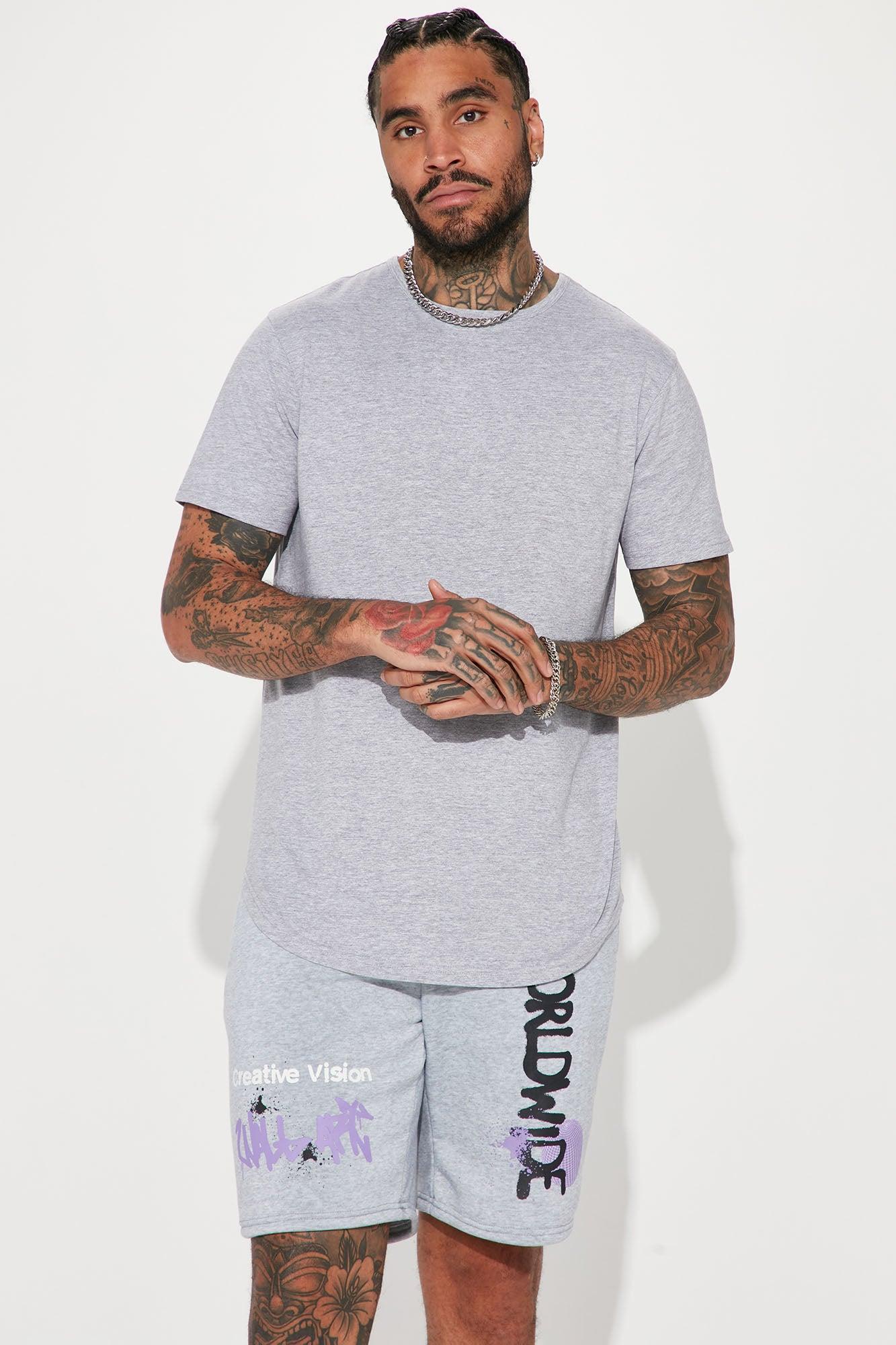 Model Height: 6'4 - Wearing Large Big & Tall: Height 6'5 - Wearing XXXL Available In Black, Heather Grey, Tan And White. Crew Neck Short Sleeve Scallop Hem 90% Cotton 10% Viscose Imported
