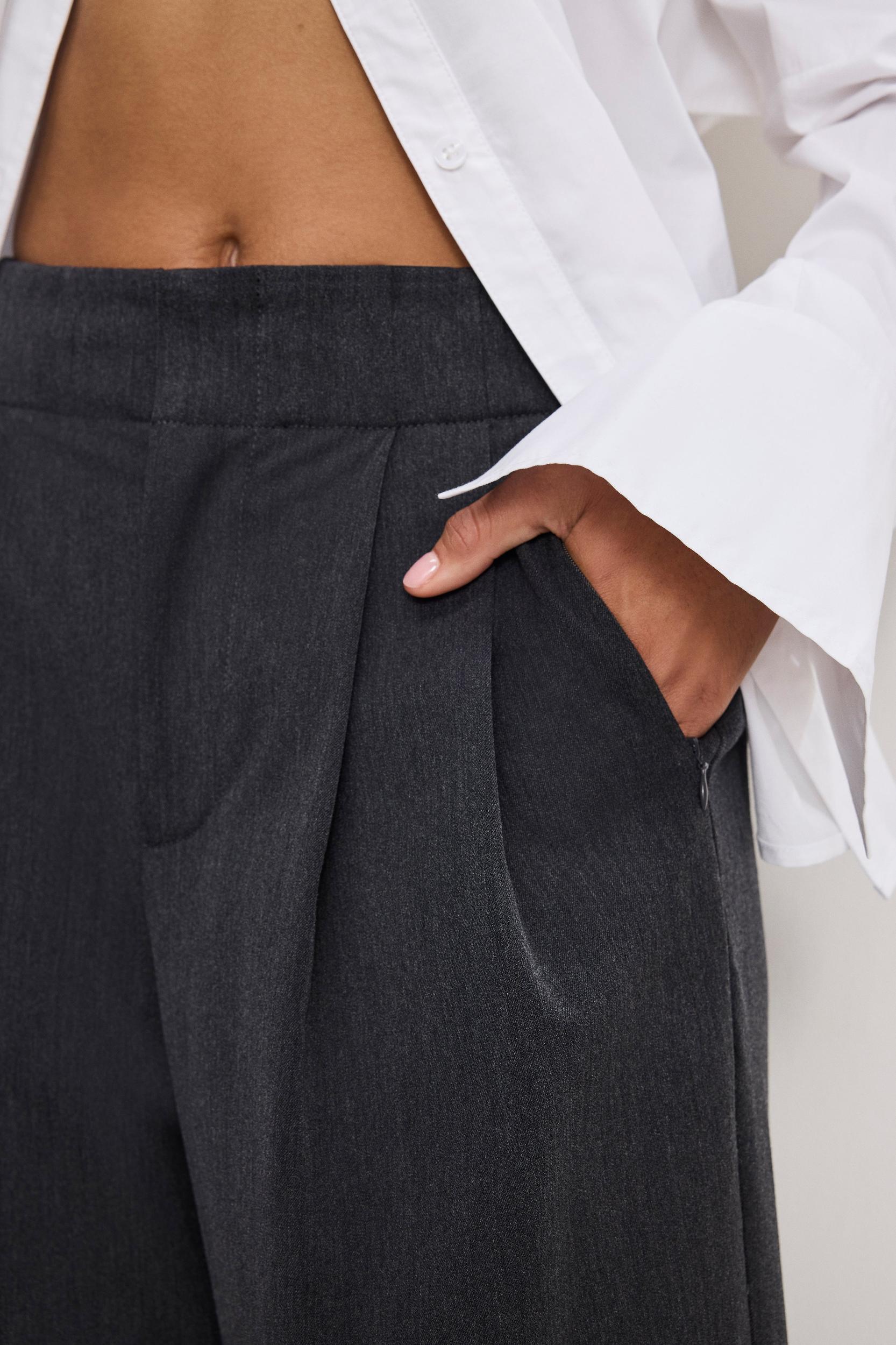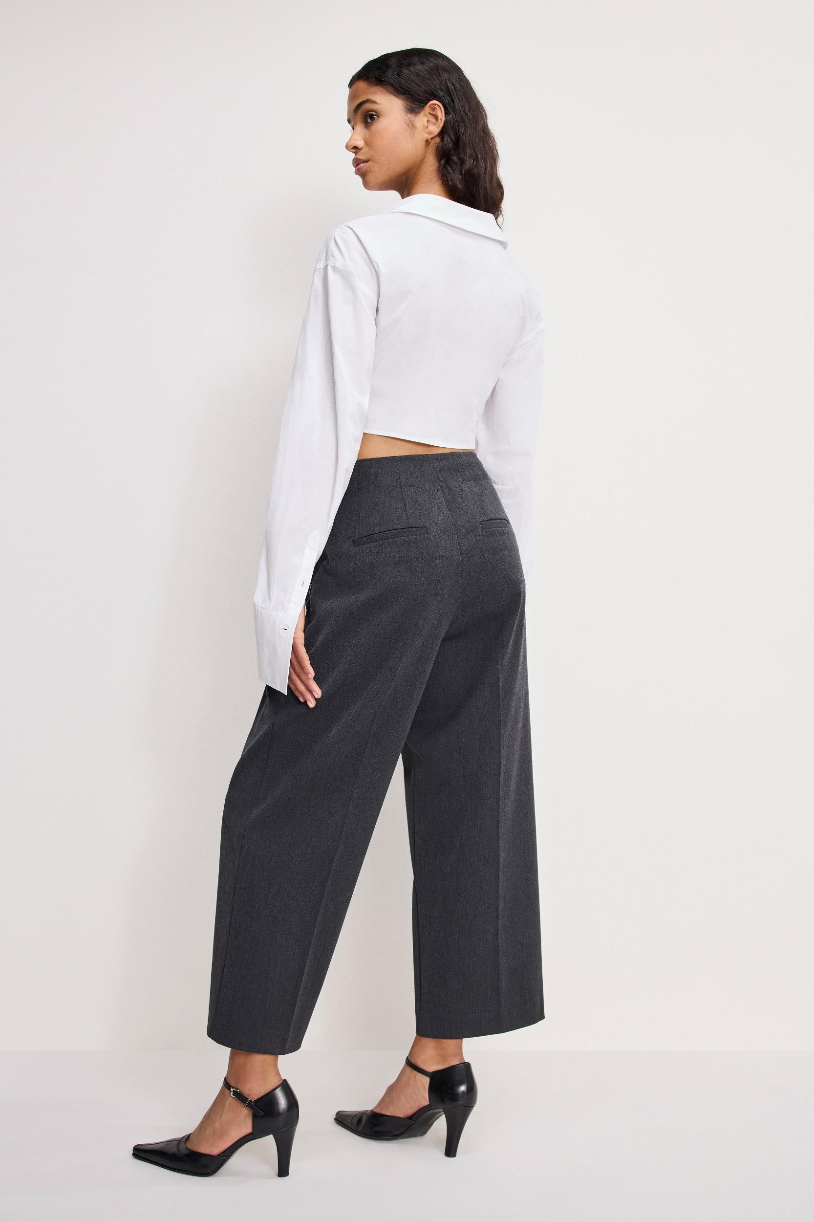 Our Essential Suiting Pleated Cropped Trousers sit high on the waist with a smooth, cropped fit through the thigh and a clean hem. Tailored enough to turn heads, comfortable enough to wear on repeat. Pair it with the Essential Suiting Sculpted Blazer or the Essential Suiting Oversized Double Breasted Blazer for a fully finished look. High-rise Cropped fit Seaming detail at front Back waist darts Non-functional back welt pockets Clean hem Belt loops Inseam: 26" Fabric: 69% Polyester, 28% Viscose, 3% Spandex Care: Machine wash cold. Do not bleach. Line dry. Iron if needed or dry clean.