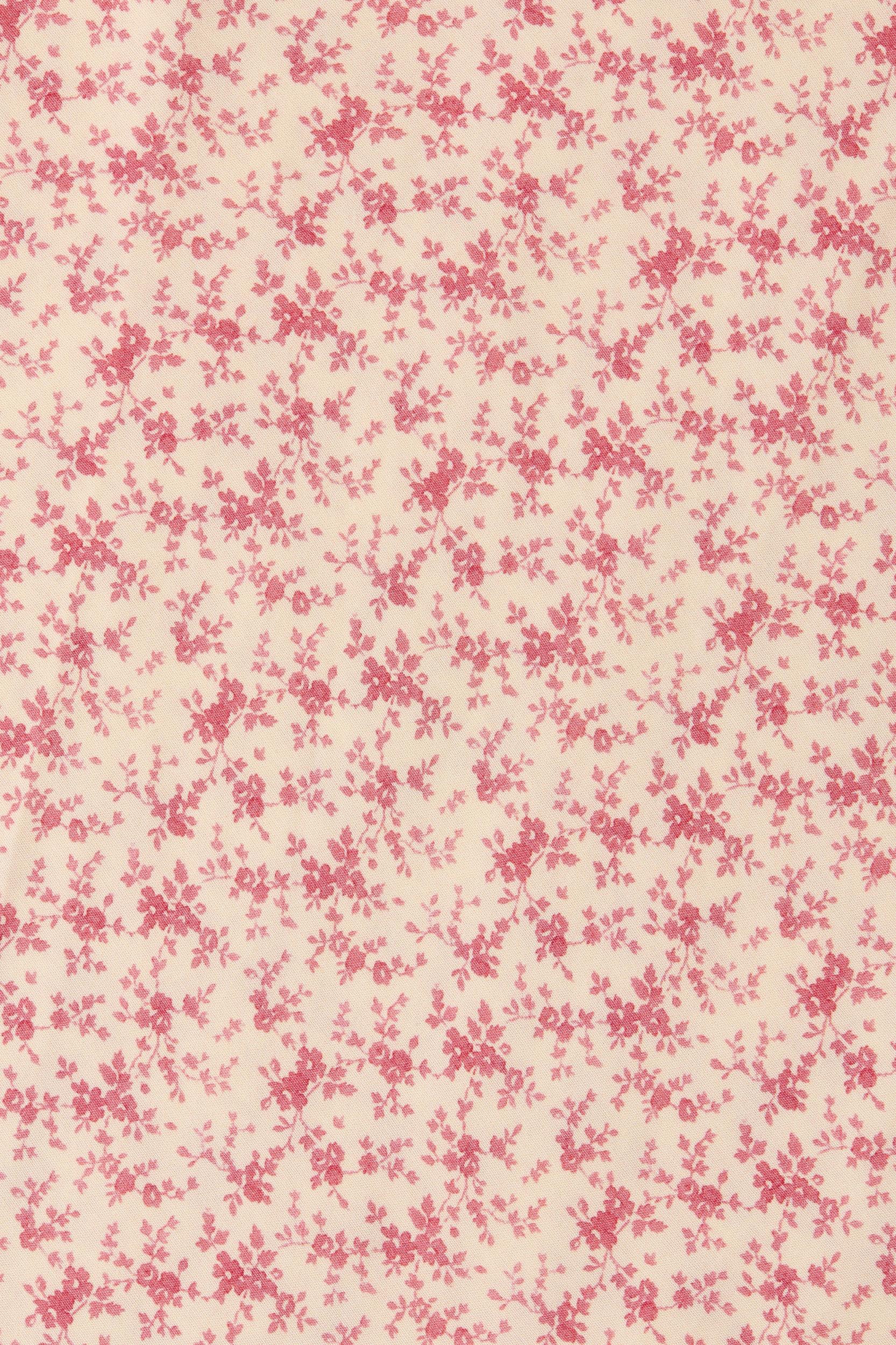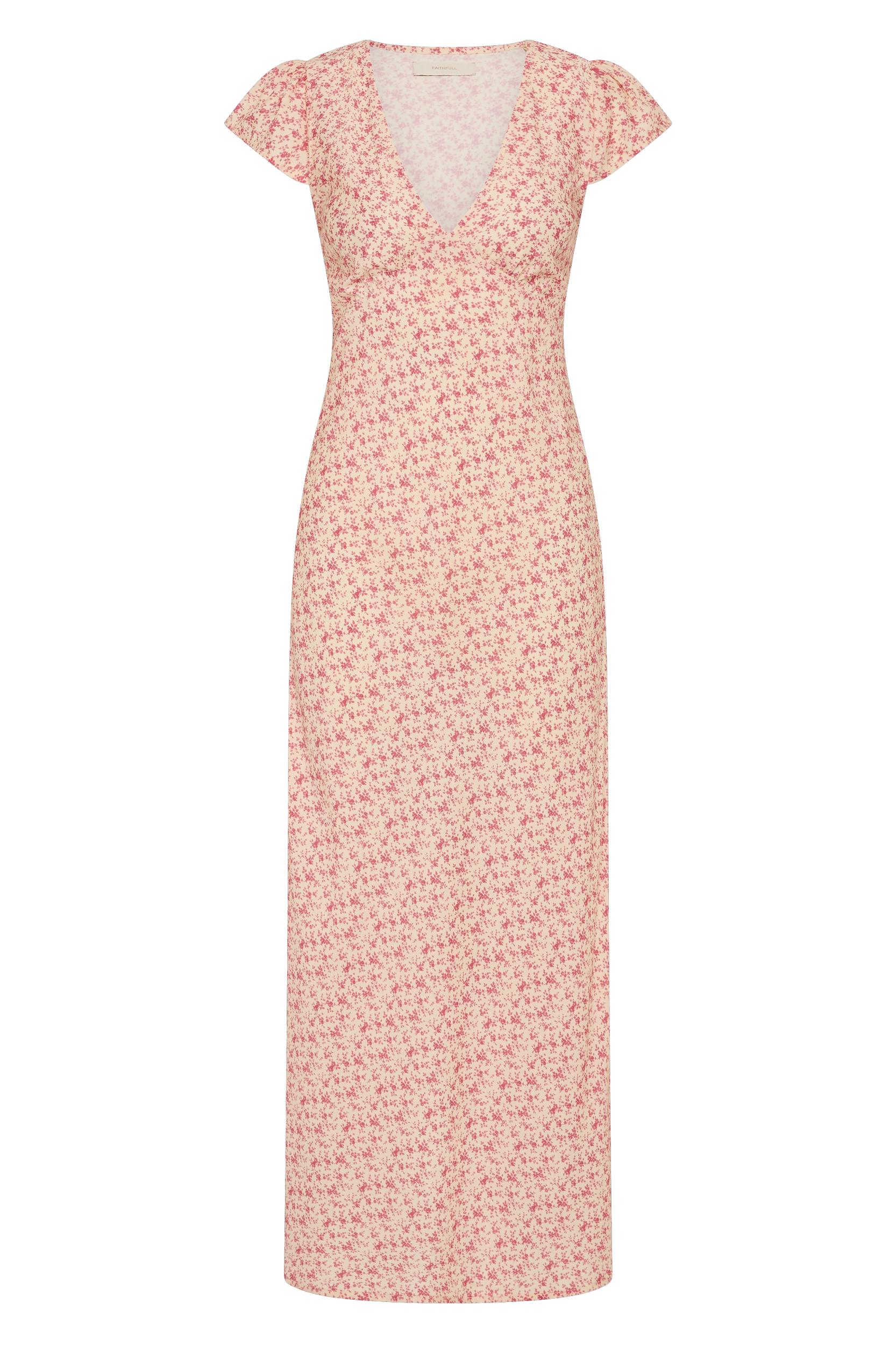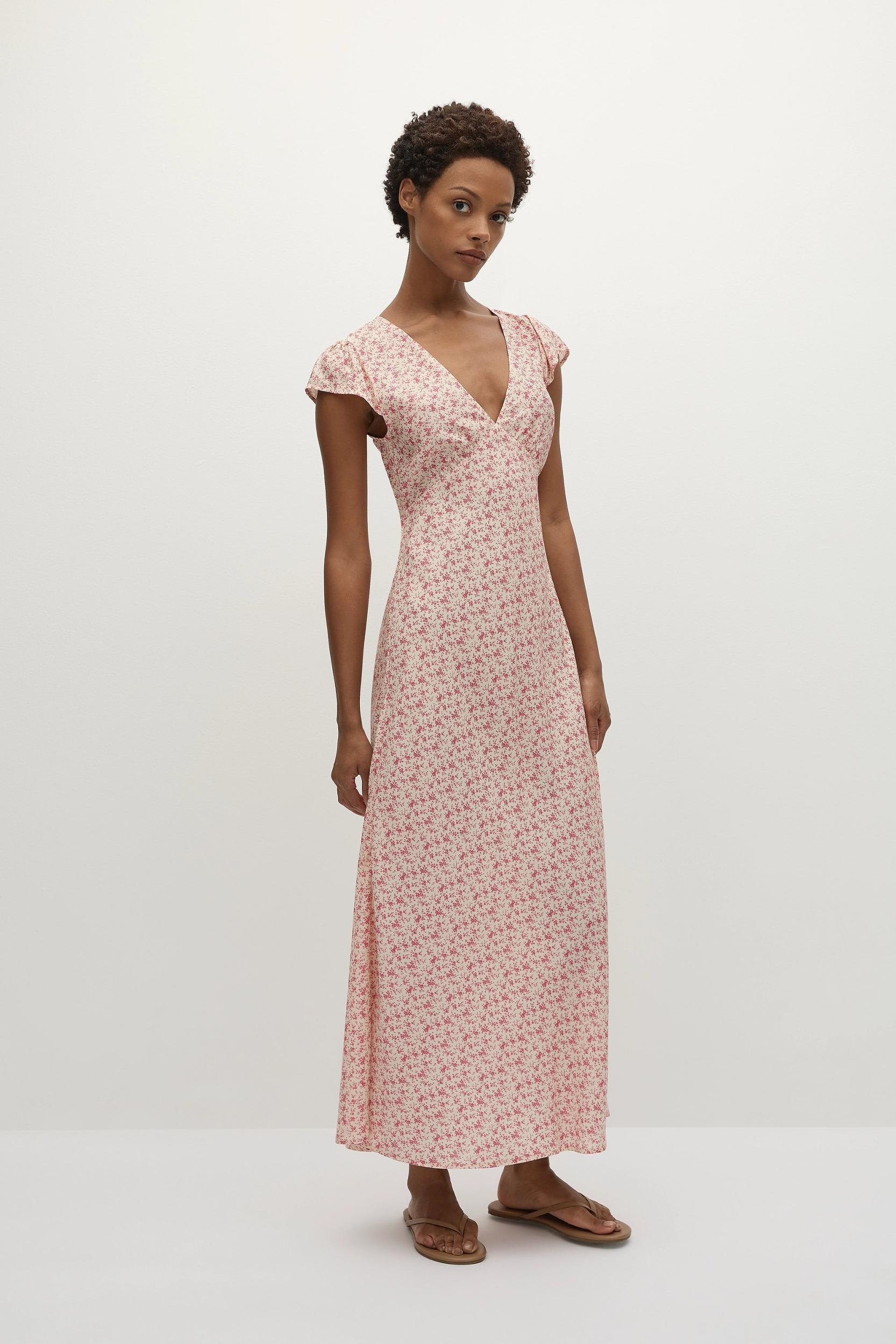 A feminine midi dress with a deep V-neckline and short cap sleeves. With subtle gathering under the bust and a crossover detail for a more flattering finish, it falls softly in line with the body before falling into an A-line skirt that crops just above the ankles. There are also back waist ties for custom cinching. Designed from a soft rayon fabrication in a vintage-inspired floral motif with muted pink tones, style with a simple ballet flat for everyday summer dressing. This style is true to size. The back ties are adjustable for custom fit through the bodice.