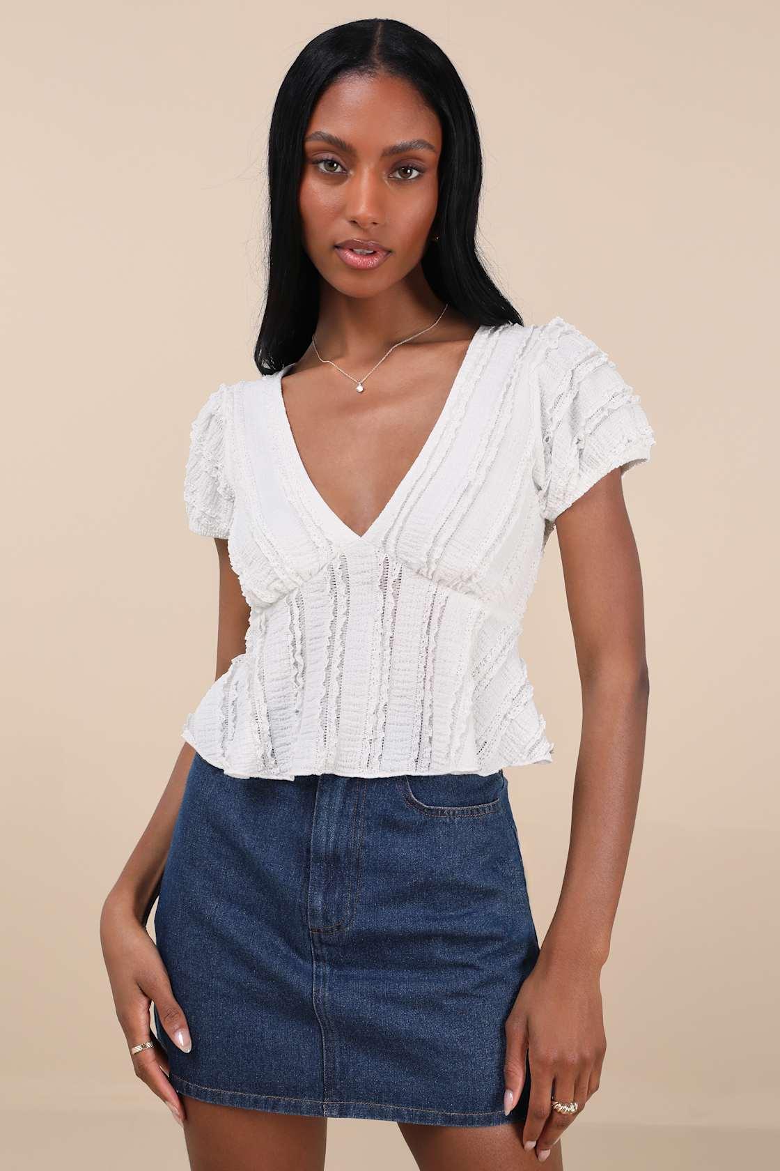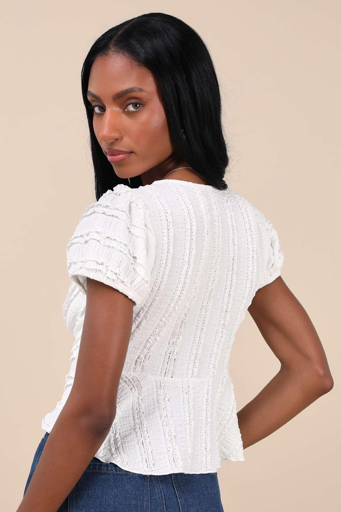 The Lulus Estela Ivory Ruffled Puff Sleeve Peplum Crop Top serves absolutely angelic vibes all day long! Textured woven fabric and lacy ruffles come together to create a tonal-striped design across this cute peplum-style top. Short sleeves with puff shoulders (and elasticized cuffs) frame the flattering V-neckline and fluttery cropped bodice.