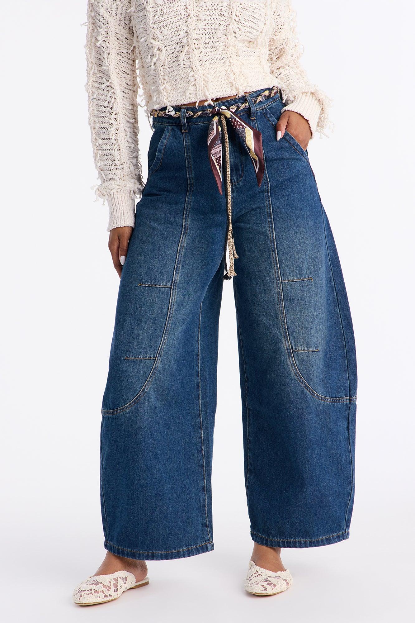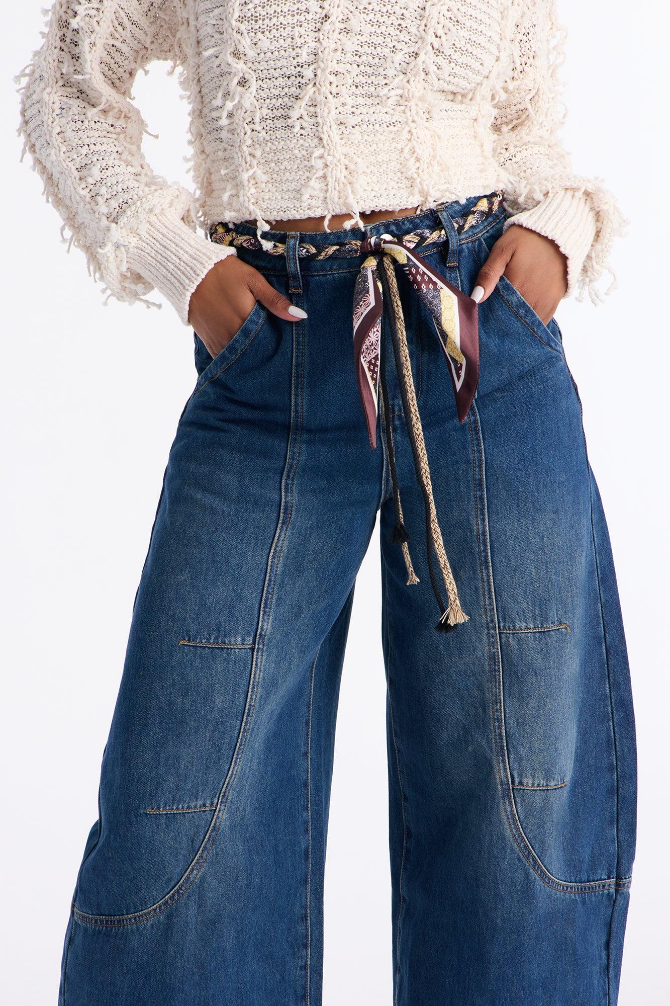 Euro Trip Belted Barrel Leg Jeans - Dark Wash Female