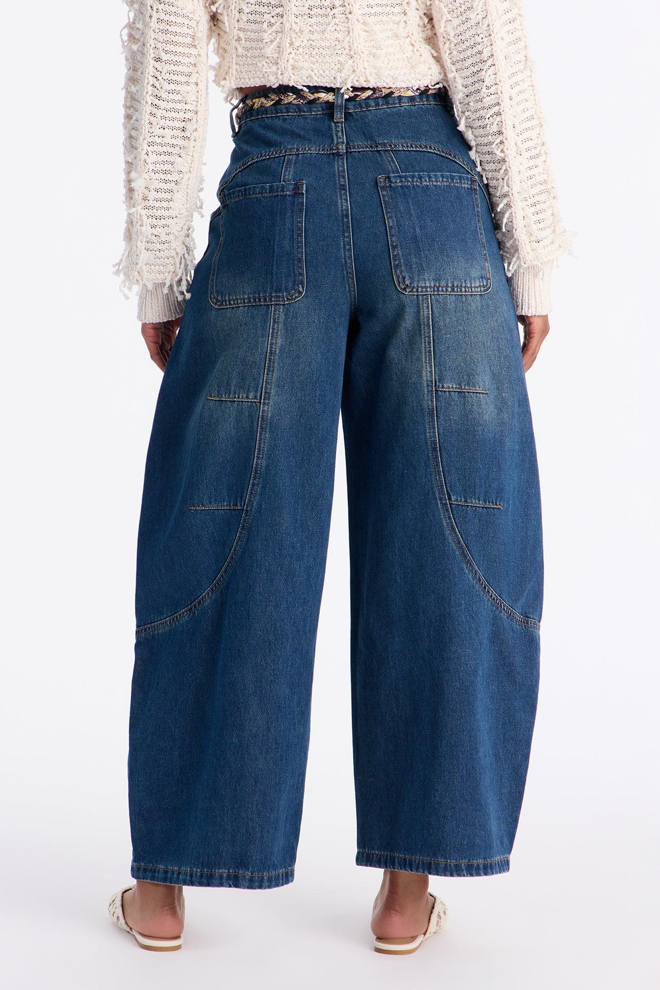 Available In Dark Wash. Barrel Leg Jean Oversized Pockets Removable Belt Dropped Crotch 14.5" Rise 28" Inseam Non-Stretch Disclaimer: Due To The Specialized Wash Process, Each Garment Is Unique. Self : 90% Cotton 10% Polyester Imported