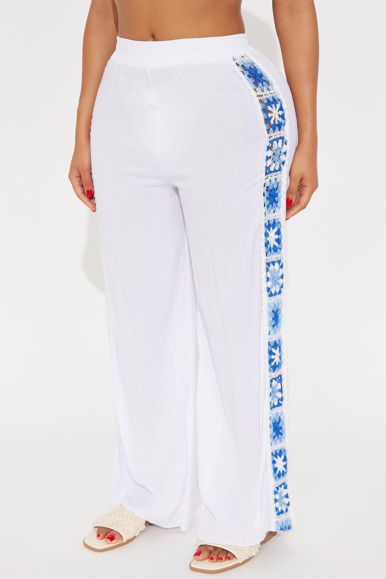 European Summers Linen Crochet Granny Square Cover Up Pants - White/Blue