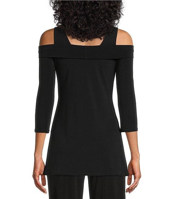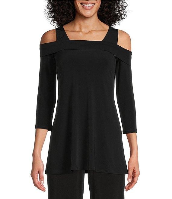 From Eva Varro, this tunic features: Knit jersey fabrication Off-the-shoulder neckline with bra-friendly wide shoulder straps 3/4 sleeves cold shoulder Lined Straight hemline Pullover construction Approx. 29" length Polyester/spandex Hand wash/flat dry Made in the USA.