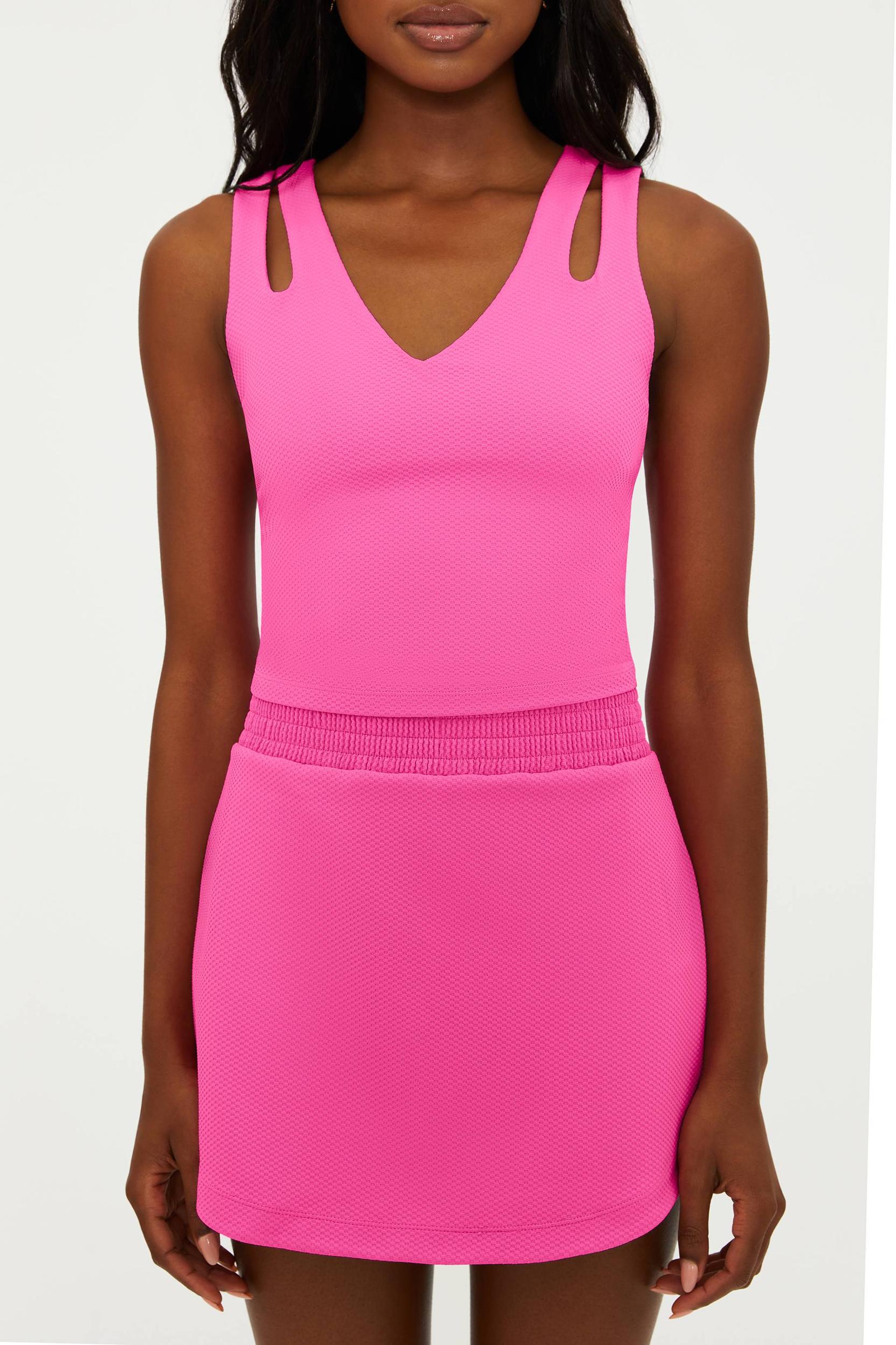 Waffle-textured fabric 79% Polyester 21% Spandex Sweat wicking Cutout straps Built-in shelf bra with removable cups V neckline Model is wearing size small