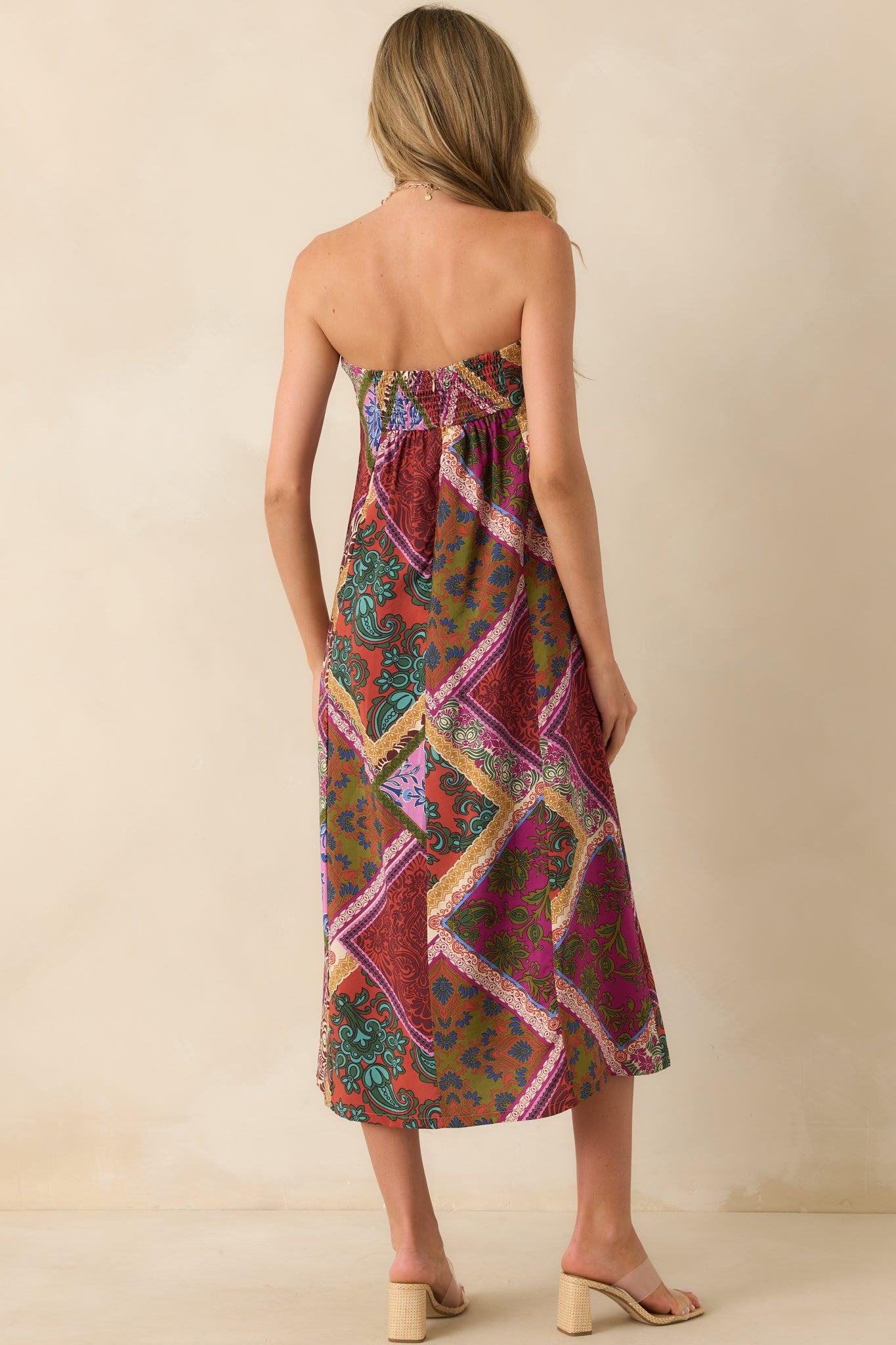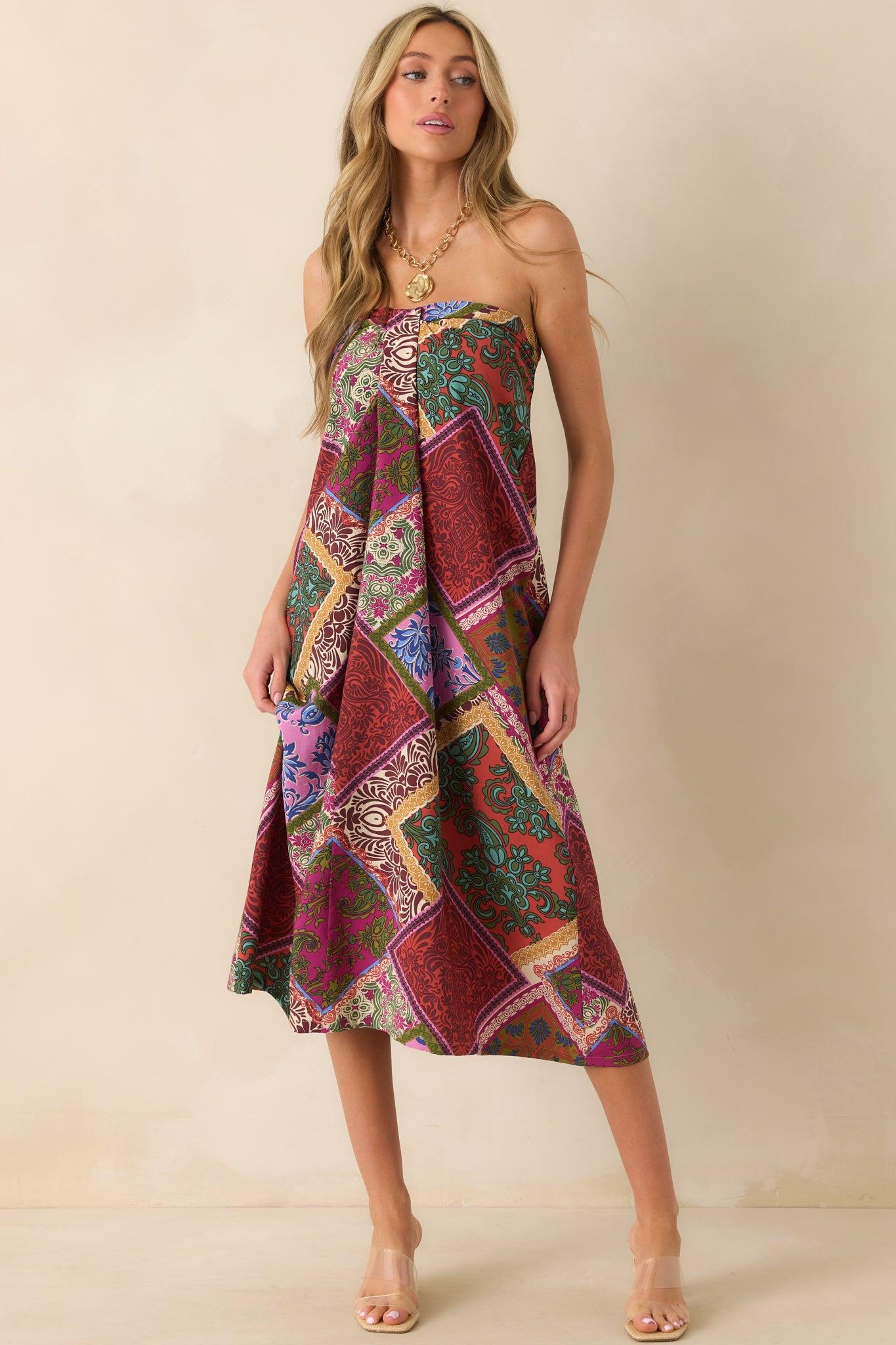 Everyone Knows Red Multi Patchwork Print Rayon Strapless Midi Dress is the kind of look that doesn’t go unnoticed. It’s playful, eye-catching, and made for those moments when you want to show up and stand out. This midi dress features a red multi patchwork print, strapless neckline, front box pleat detail, silicone non-slip strip, smocked back panel, hidden back zipper, and a flowy fit. 85% Rayon & 15% Nylon Lined: 95% Polyester & 5% Spandex Hand Wash Cold Manufactured in China Designed in The USA Model is 5'8" and is Wearing a Size Small