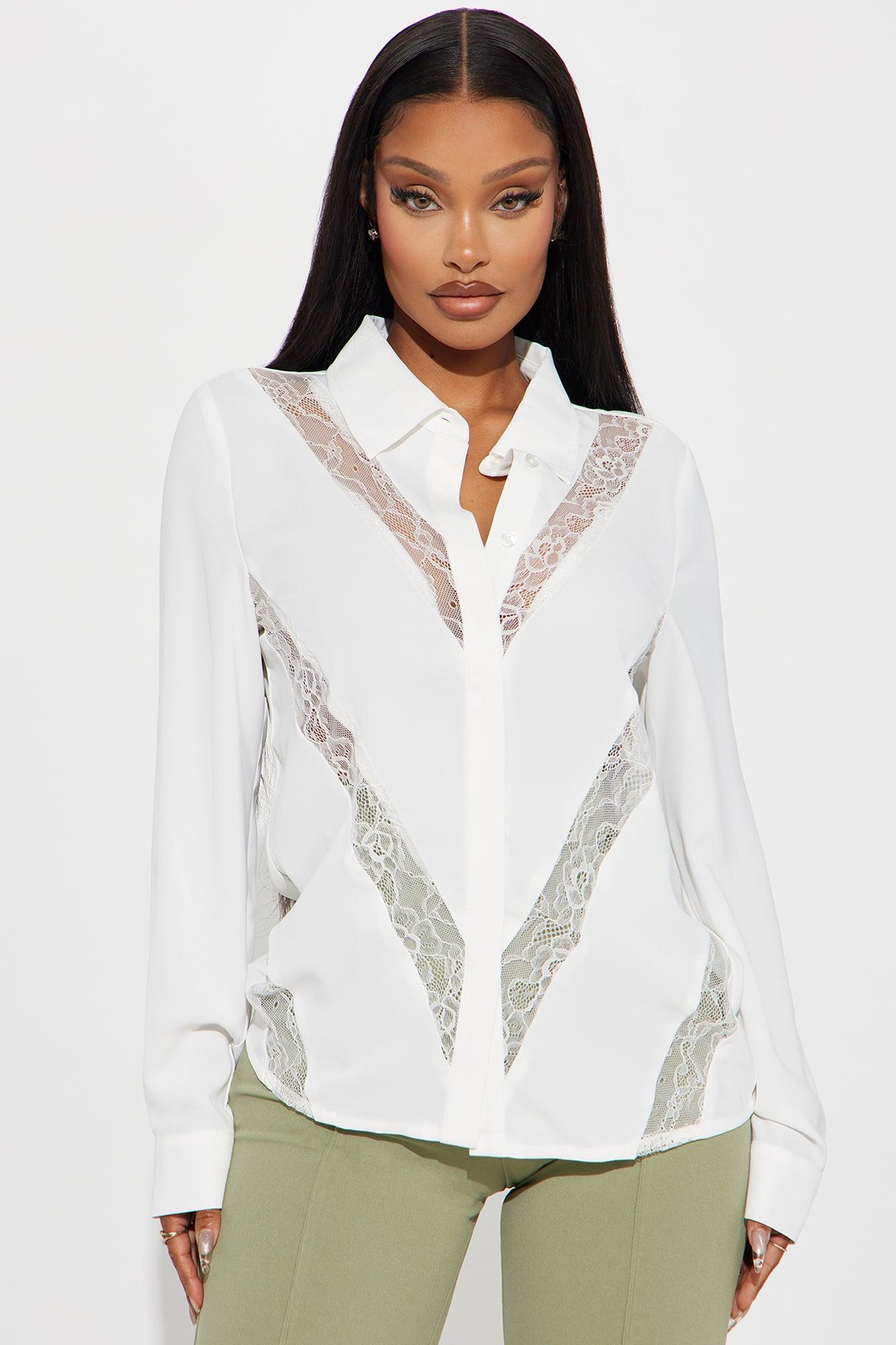 Available In White. Shirt Long Sleeve Button Down Collar Lace Cut Out Detail Non Stretch Shell: 100% Polyester Contrast: 90% Nylon 10% Spandex Imported